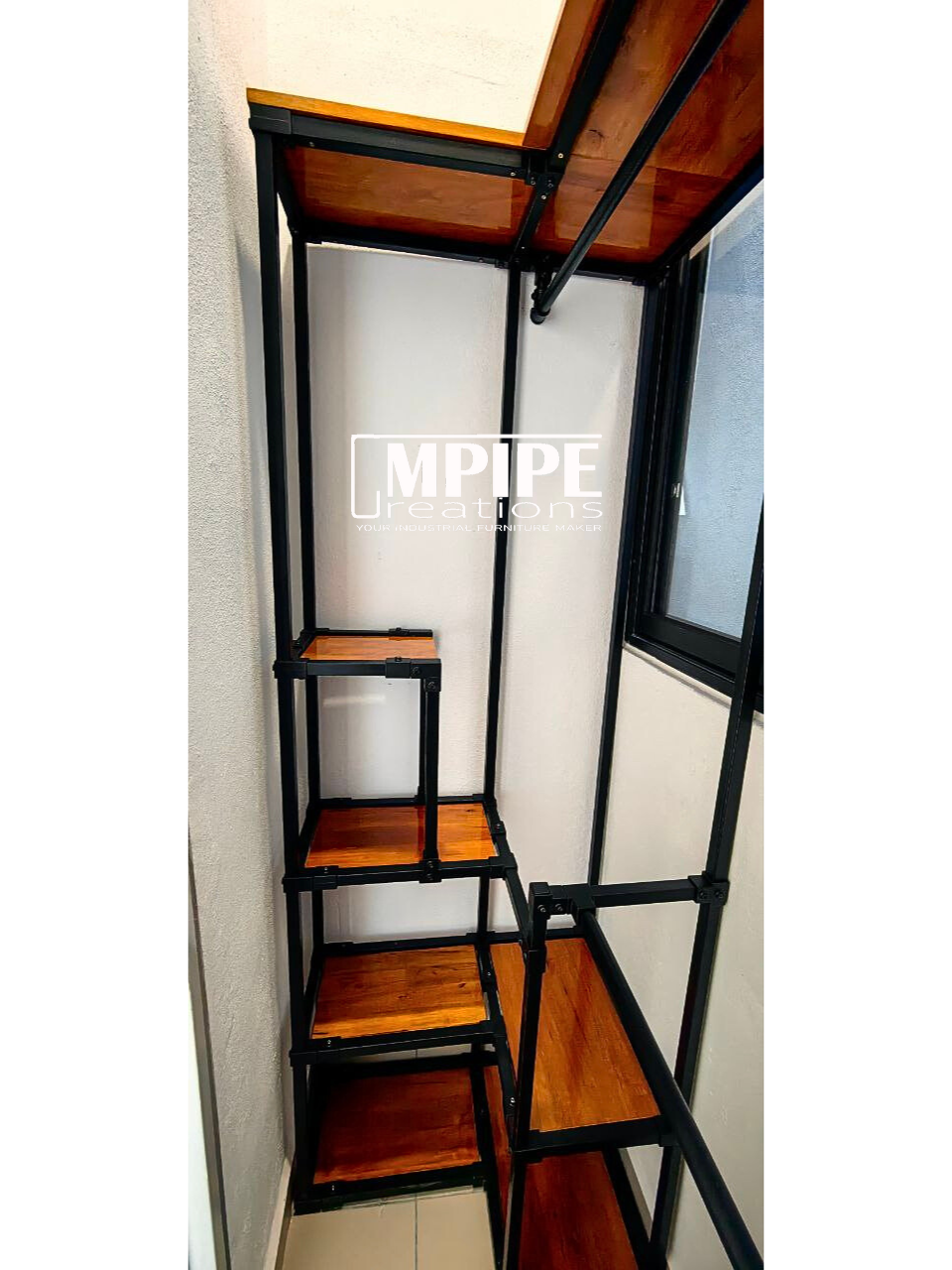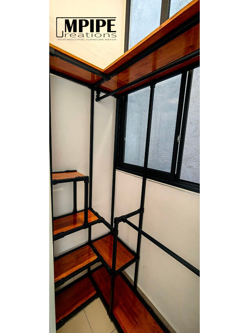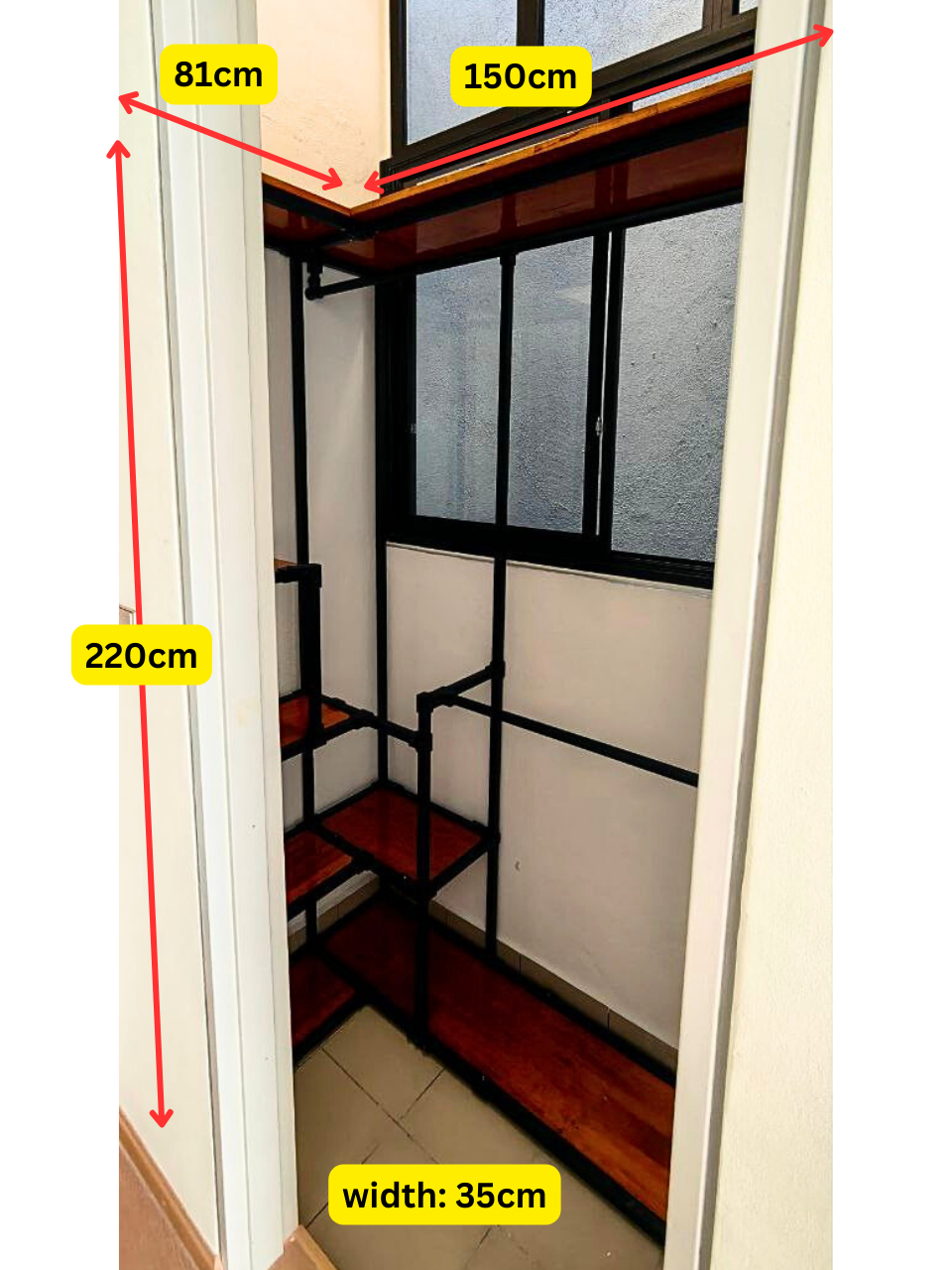This custom project was installed at Nadayu 801 Subang, where the available area was only 81cm x 150cm — an extremely tight space. Yet, we managed to maximize every inch by fitting in a practical L-shaped open wardrobe, combining sturdy square hollow steel with elegant rubberwood shelving.