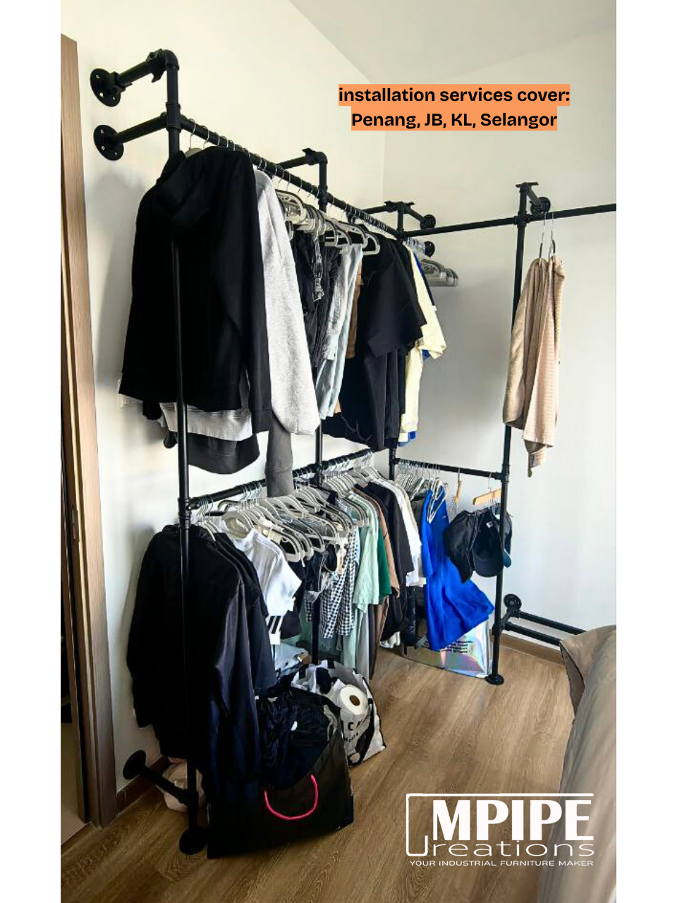 The L-Shaped Corner Clothing Rack is undeniably one of our most popular designs at M-Pipe Creations. Available in both standing and wall-mounted options, this versatile system can be paired with our premium melamine wall shelves and handcrafted drawers for a complete open wardrobe solution.
