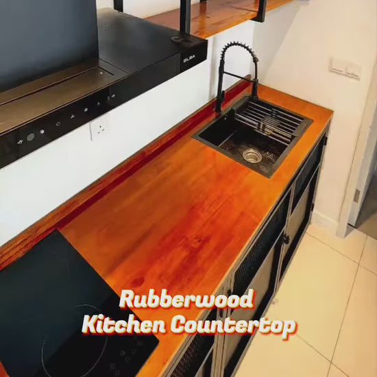 This custom kitchen set features a solid rubberwood countertop paired with matching wall shelves, designed to bring a perfect balance of warmth, function, and industrial character into your kitchen.