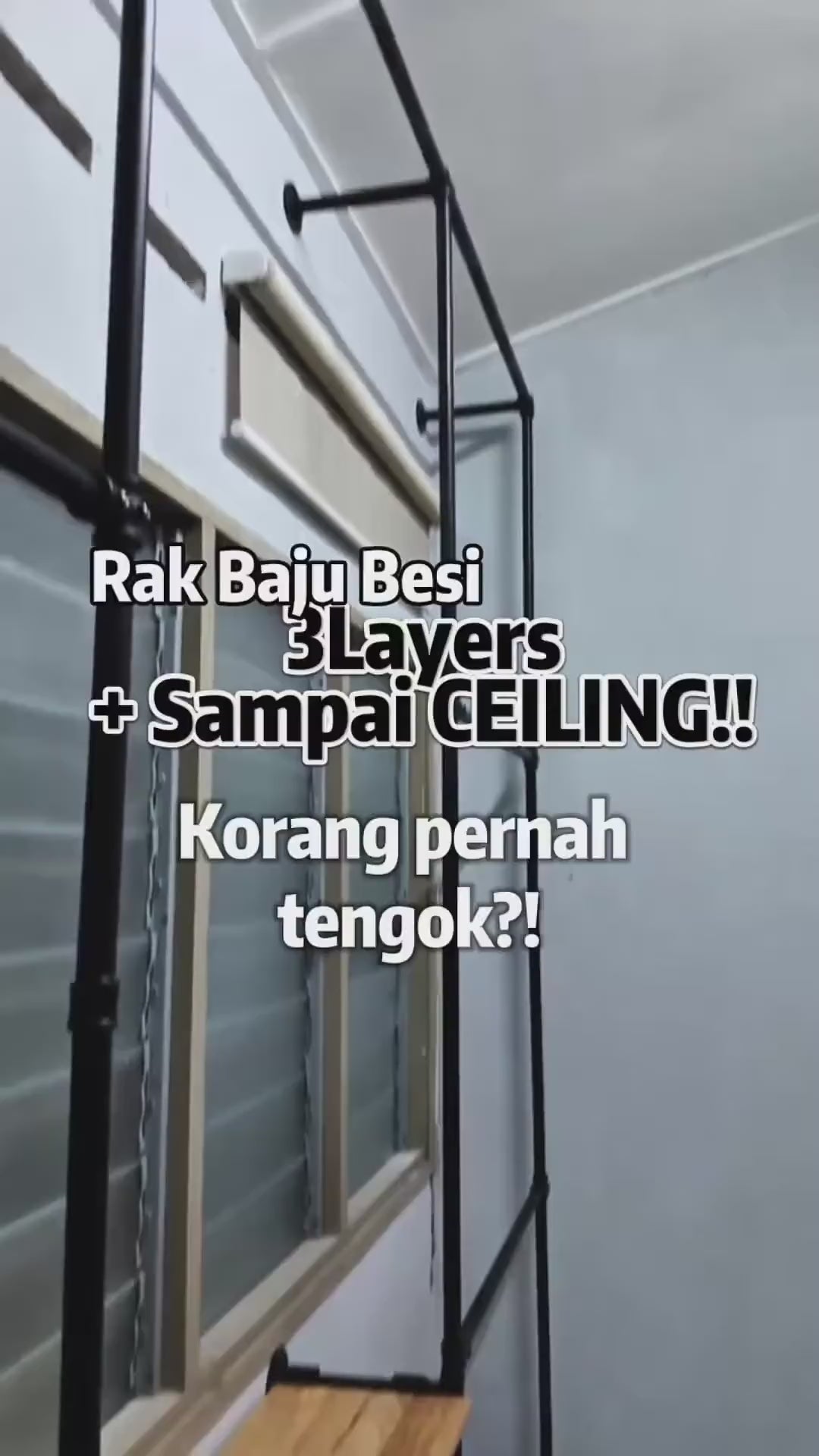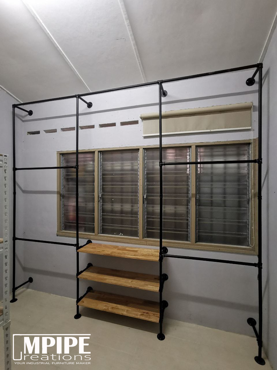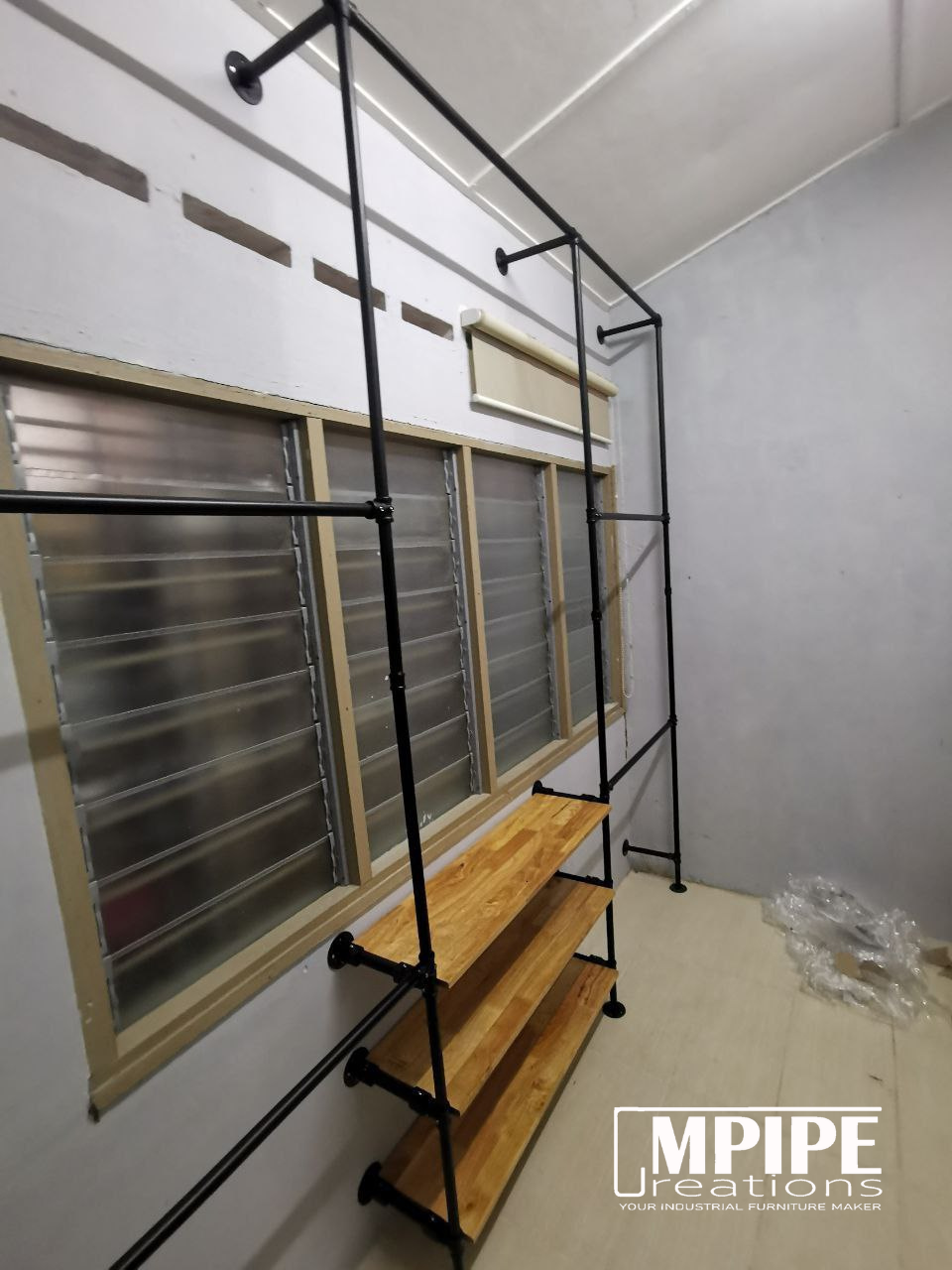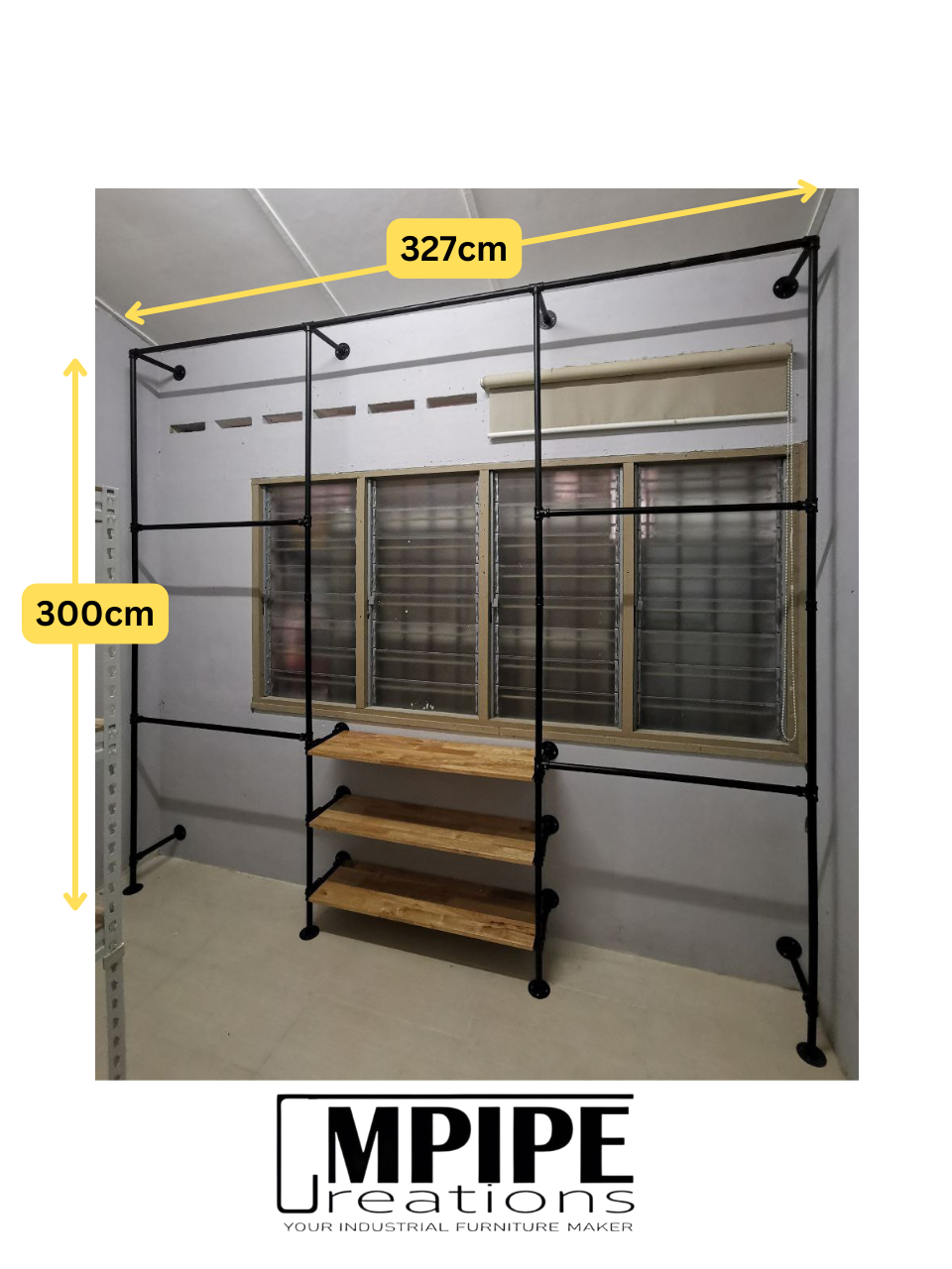 The final installation reached 300cm in height, thoughtfully divided into three functional layers. Additional wooden shelves were incorporated in the middle section, providing convenient storage for shoes, bags, or folded clothing while keeping the overall design clean and efficient.