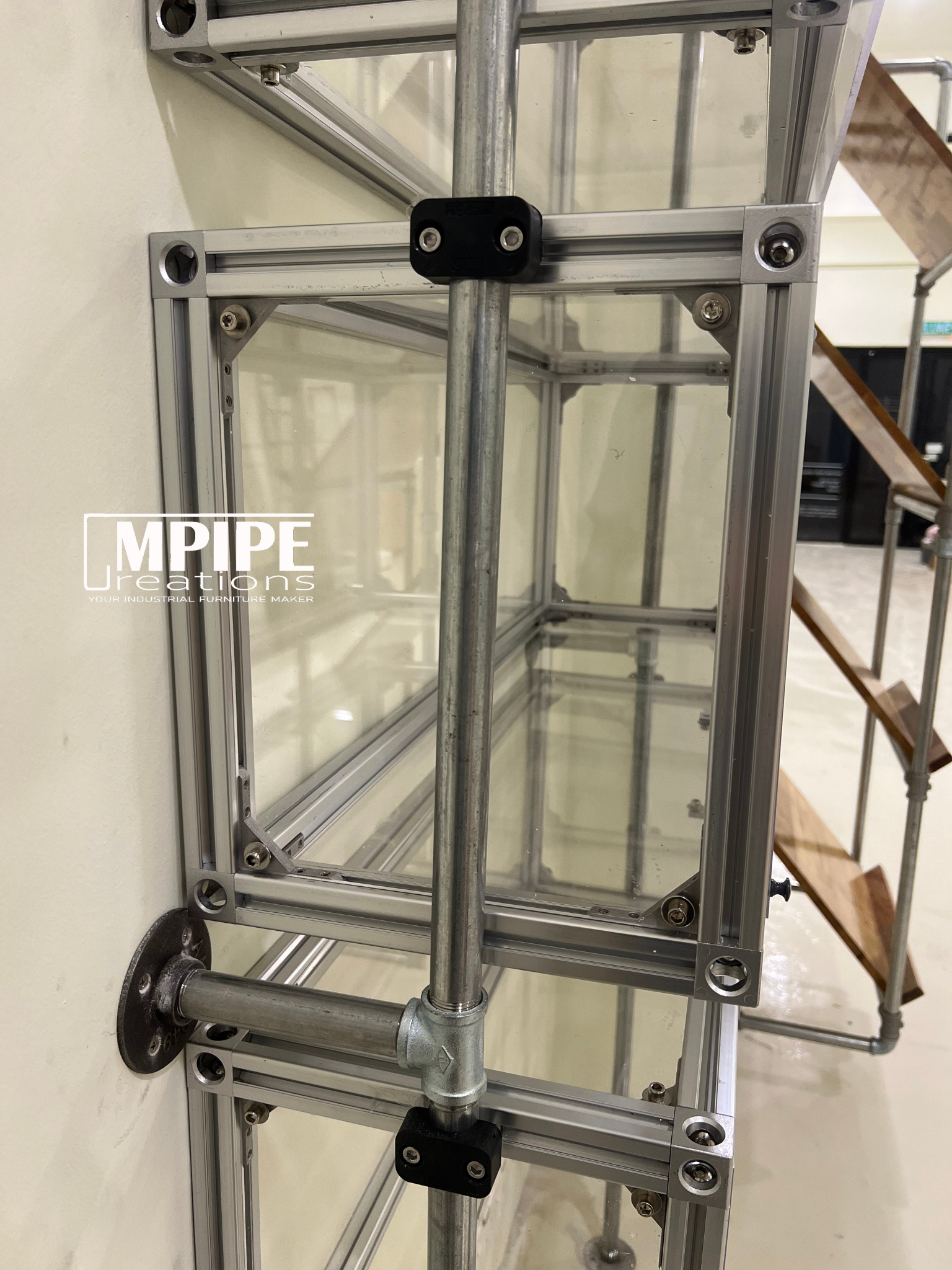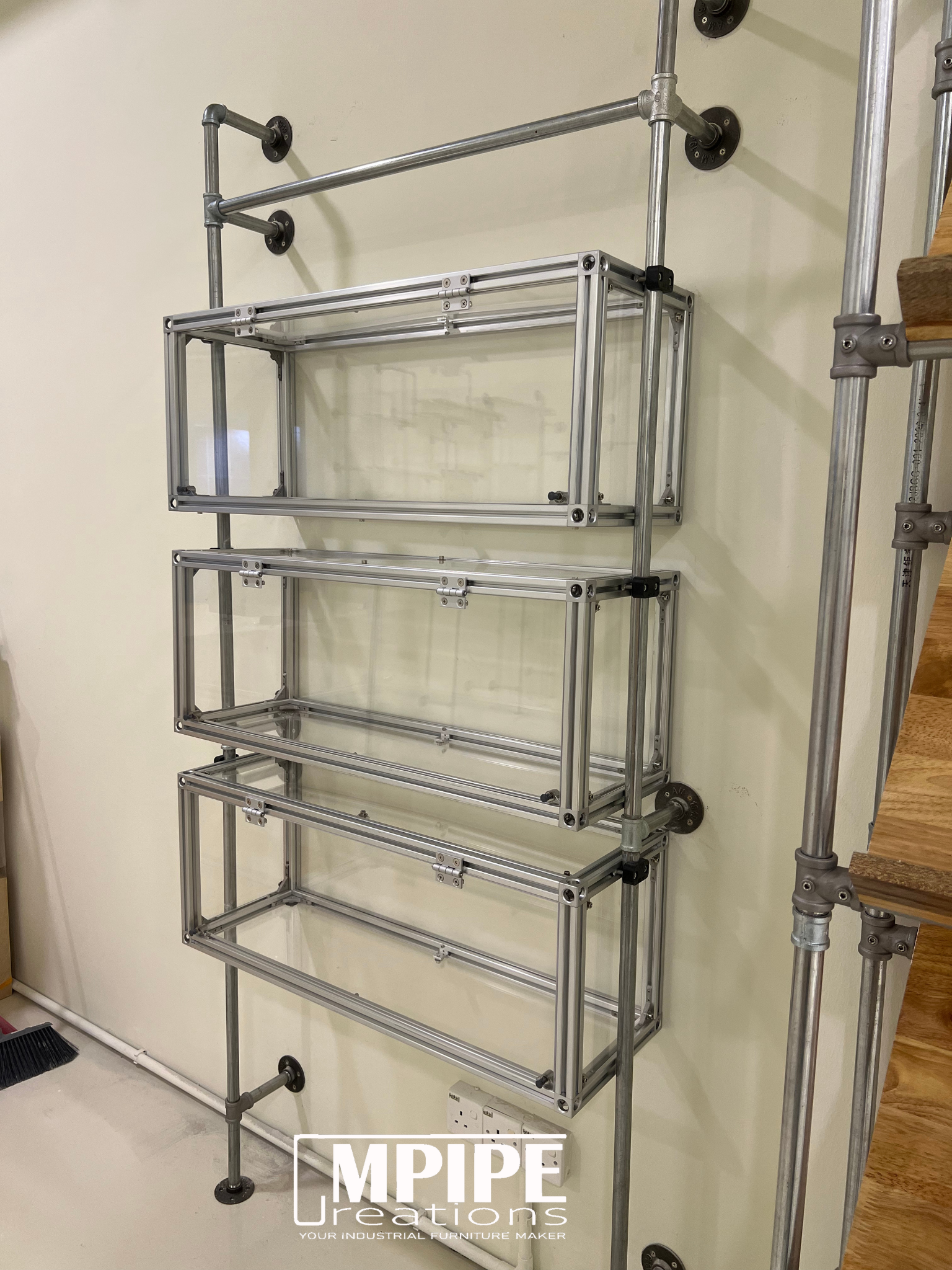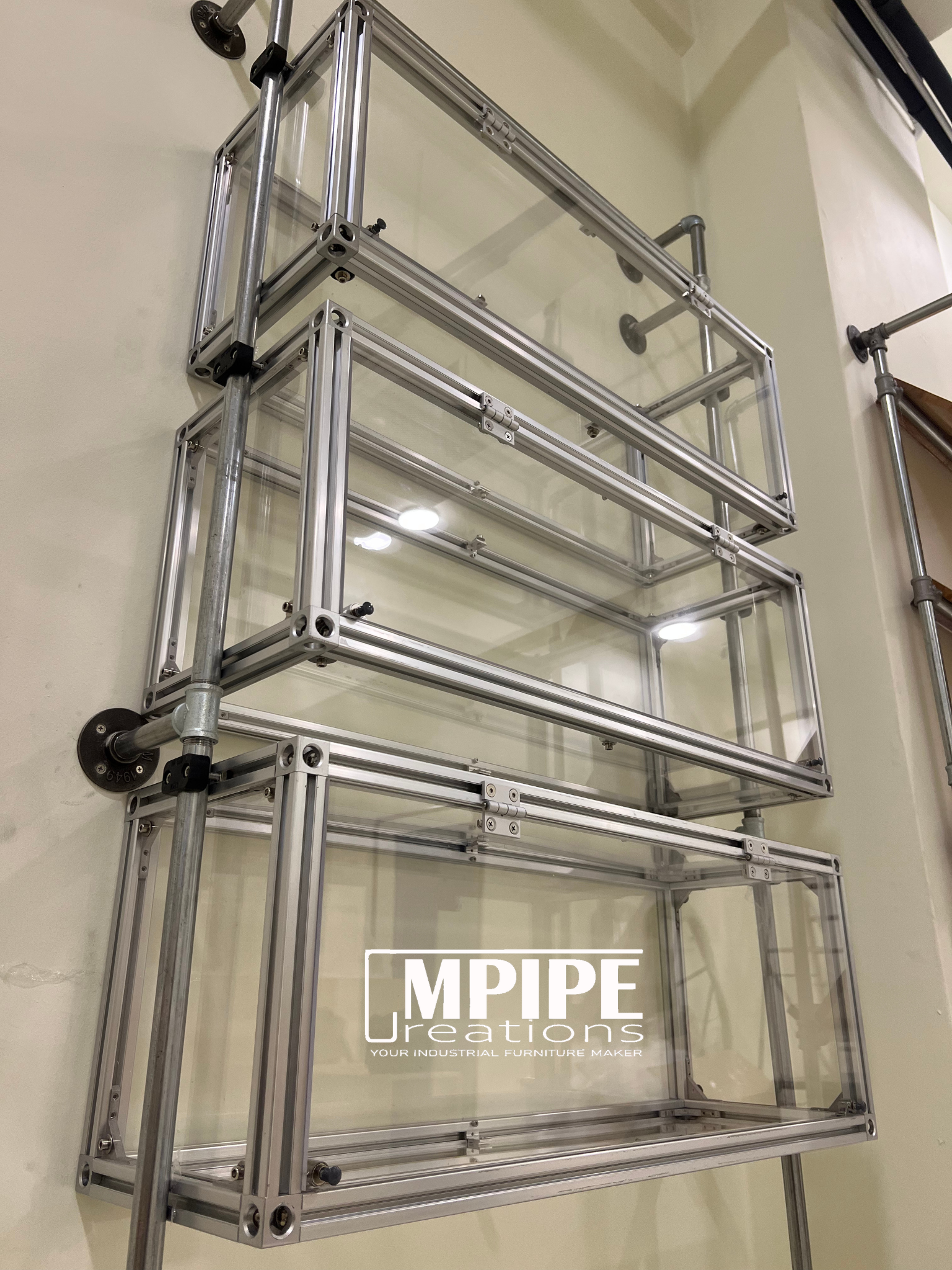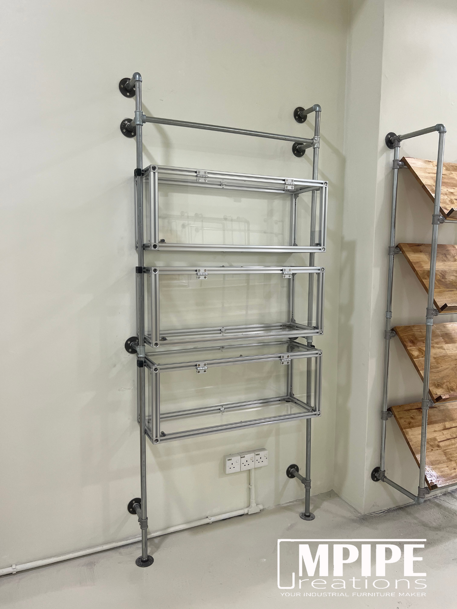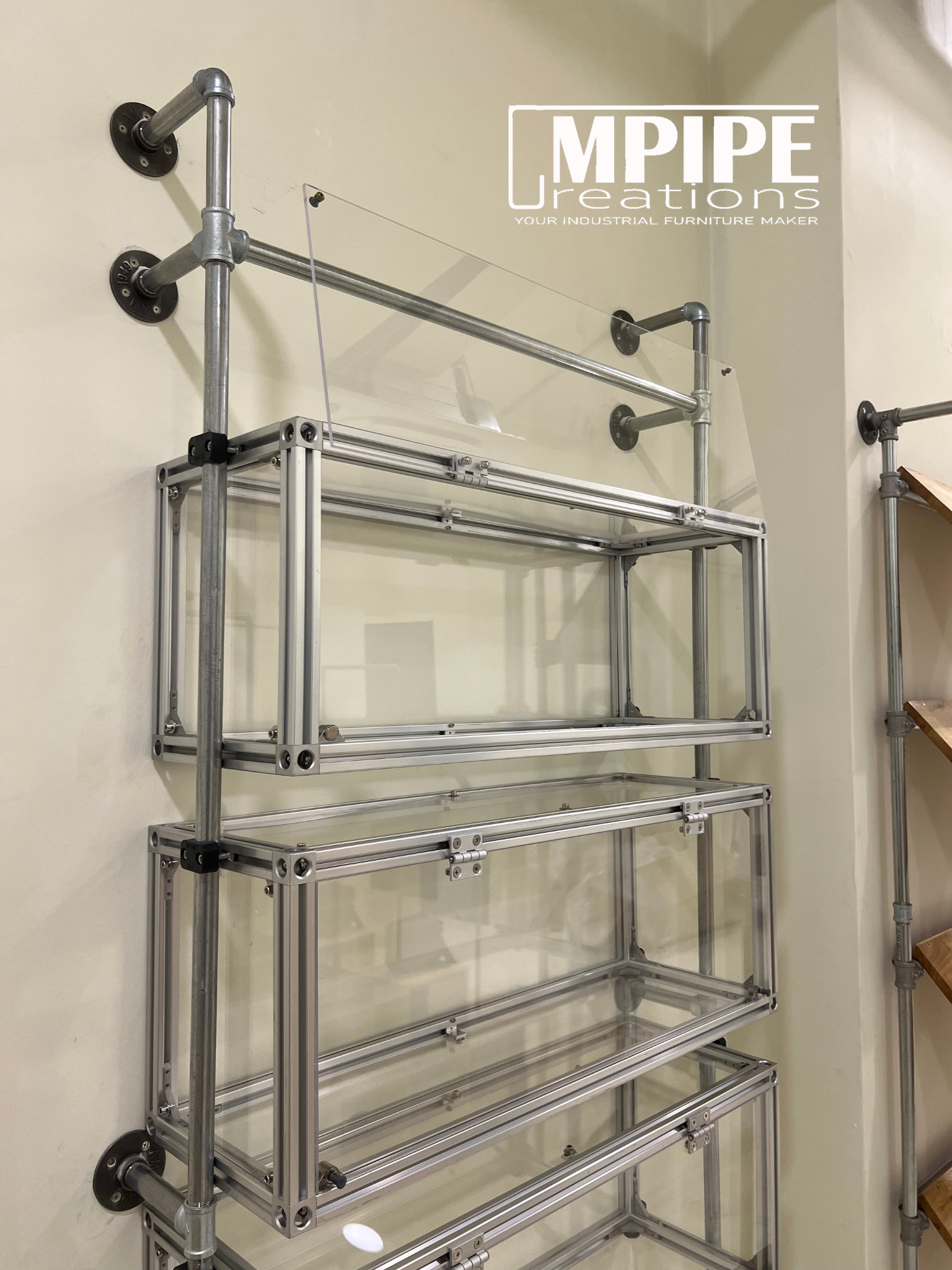 The structure is built using original silver GI Pipe, giving the entire setup a sleek, futuristic appearance. The integration of transparent acrylic boxes allows products to be showcased clearly while maintaining an organized and minimal look.