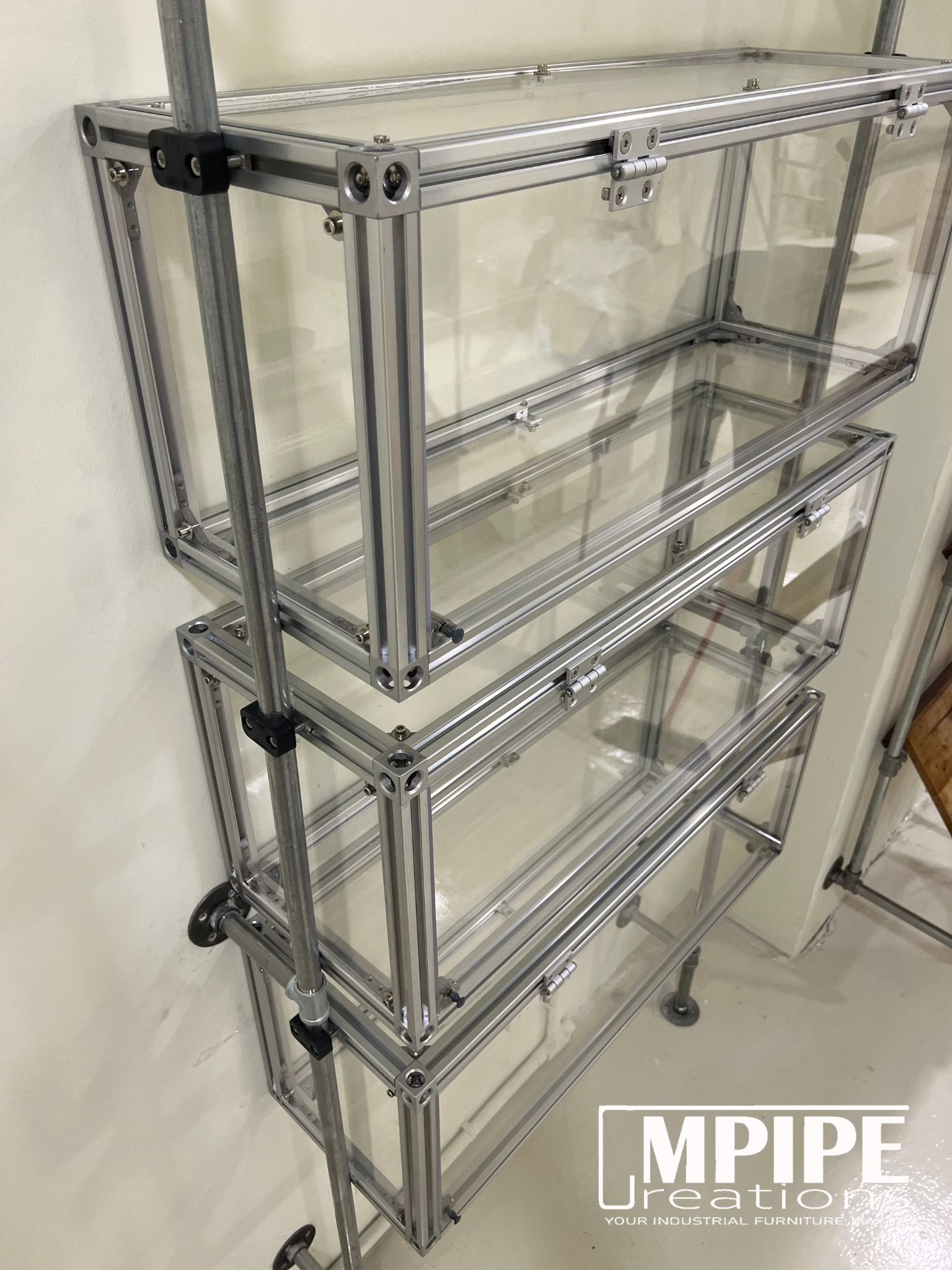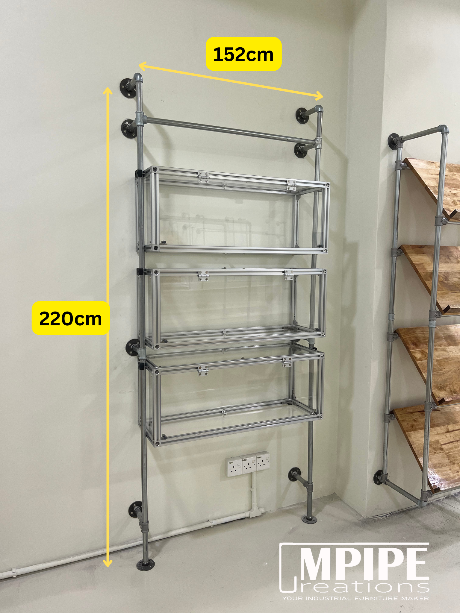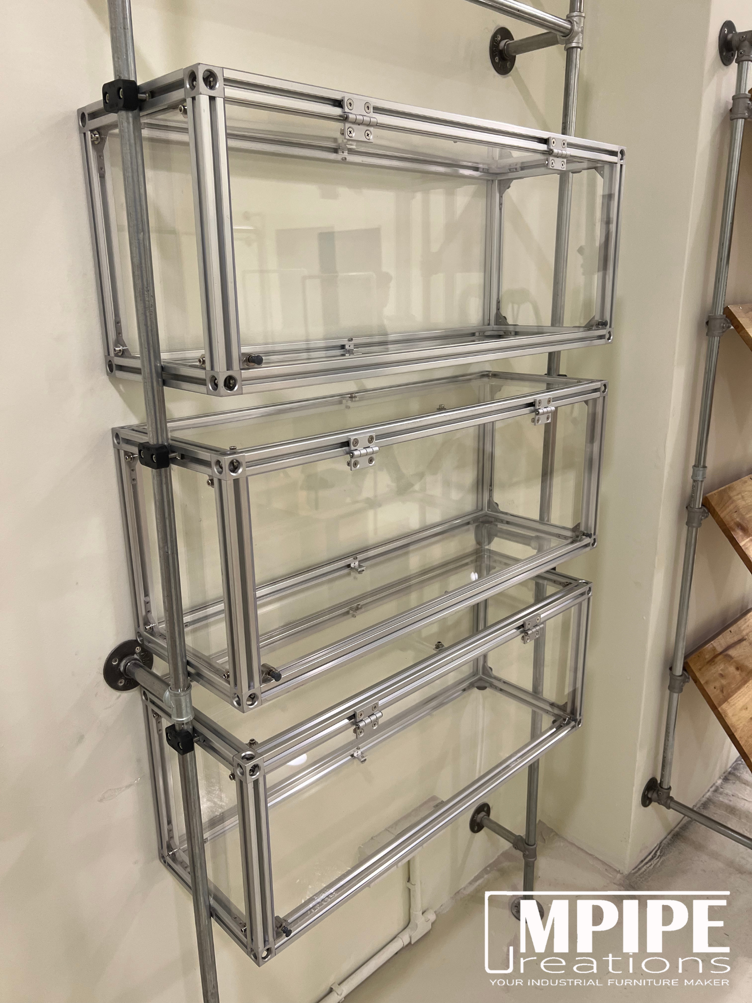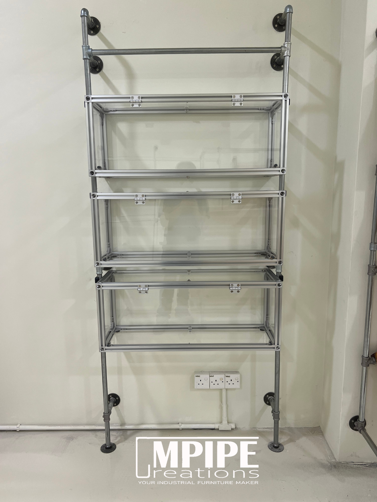 The structure is built using original silver GI Pipe, giving the entire setup a sleek, futuristic appearance. The integration of transparent acrylic boxes allows products to be showcased clearly while maintaining an organized and minimal look.