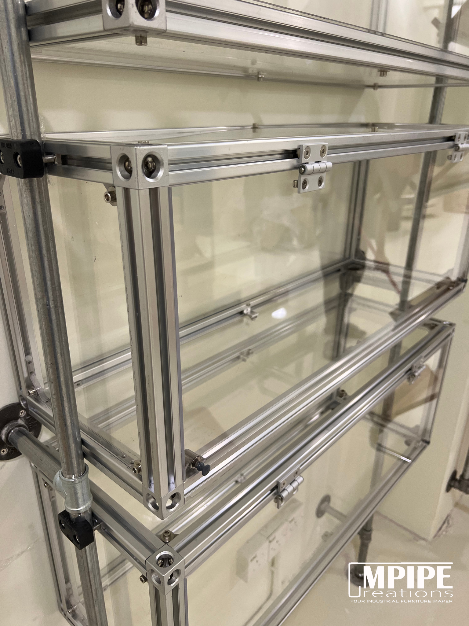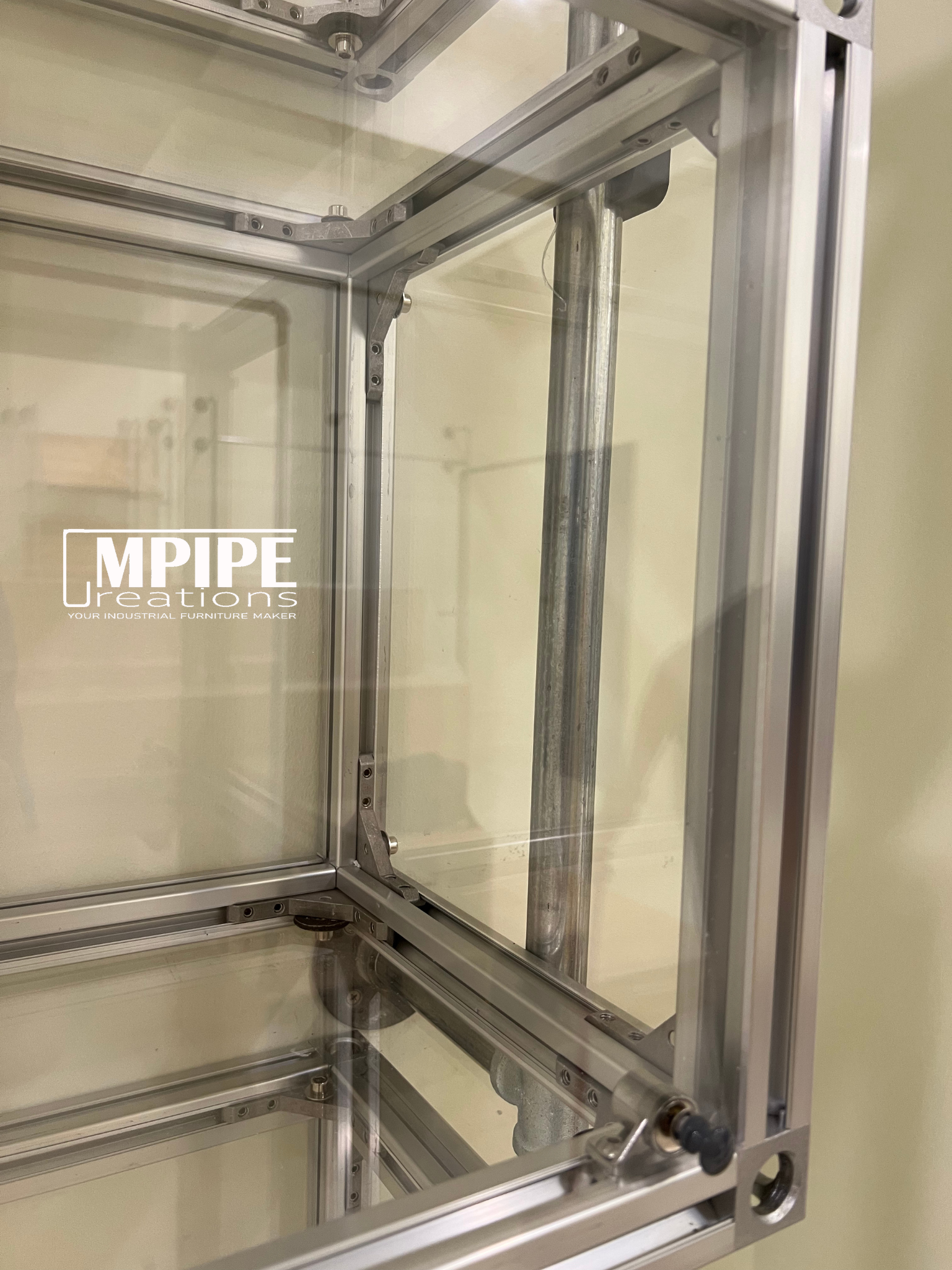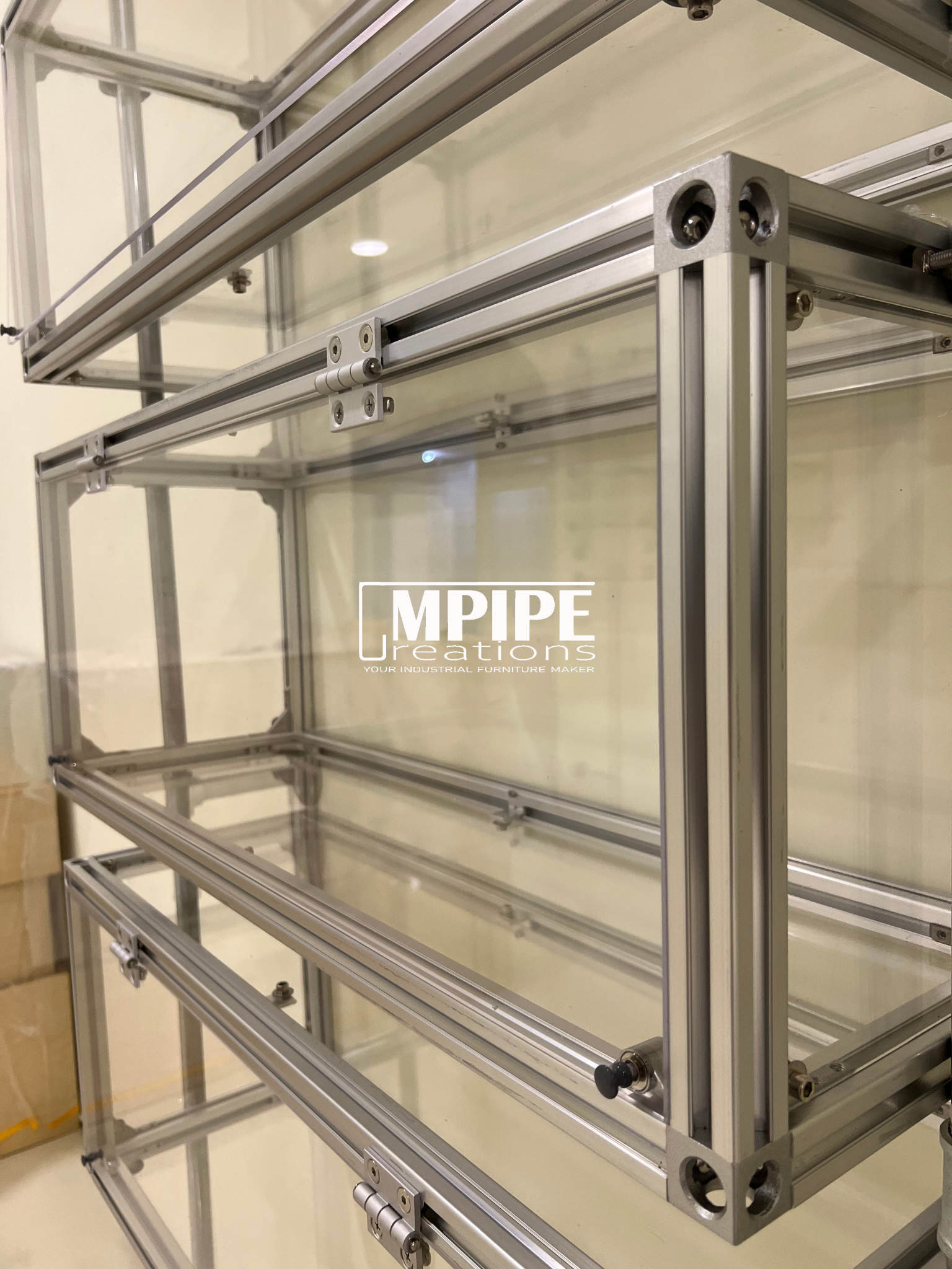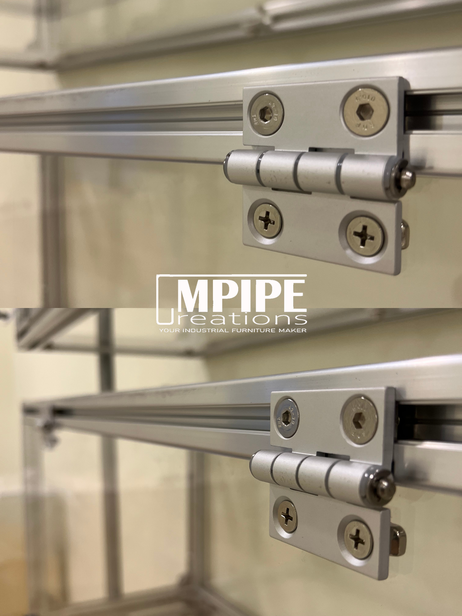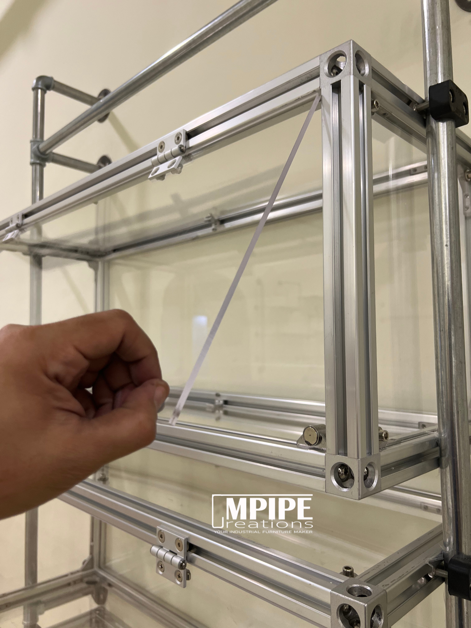 The structure is built using original silver GI Pipe, giving the entire setup a sleek, futuristic appearance. The integration of transparent acrylic boxes allows products to be showcased clearly while maintaining an organized and minimal look.