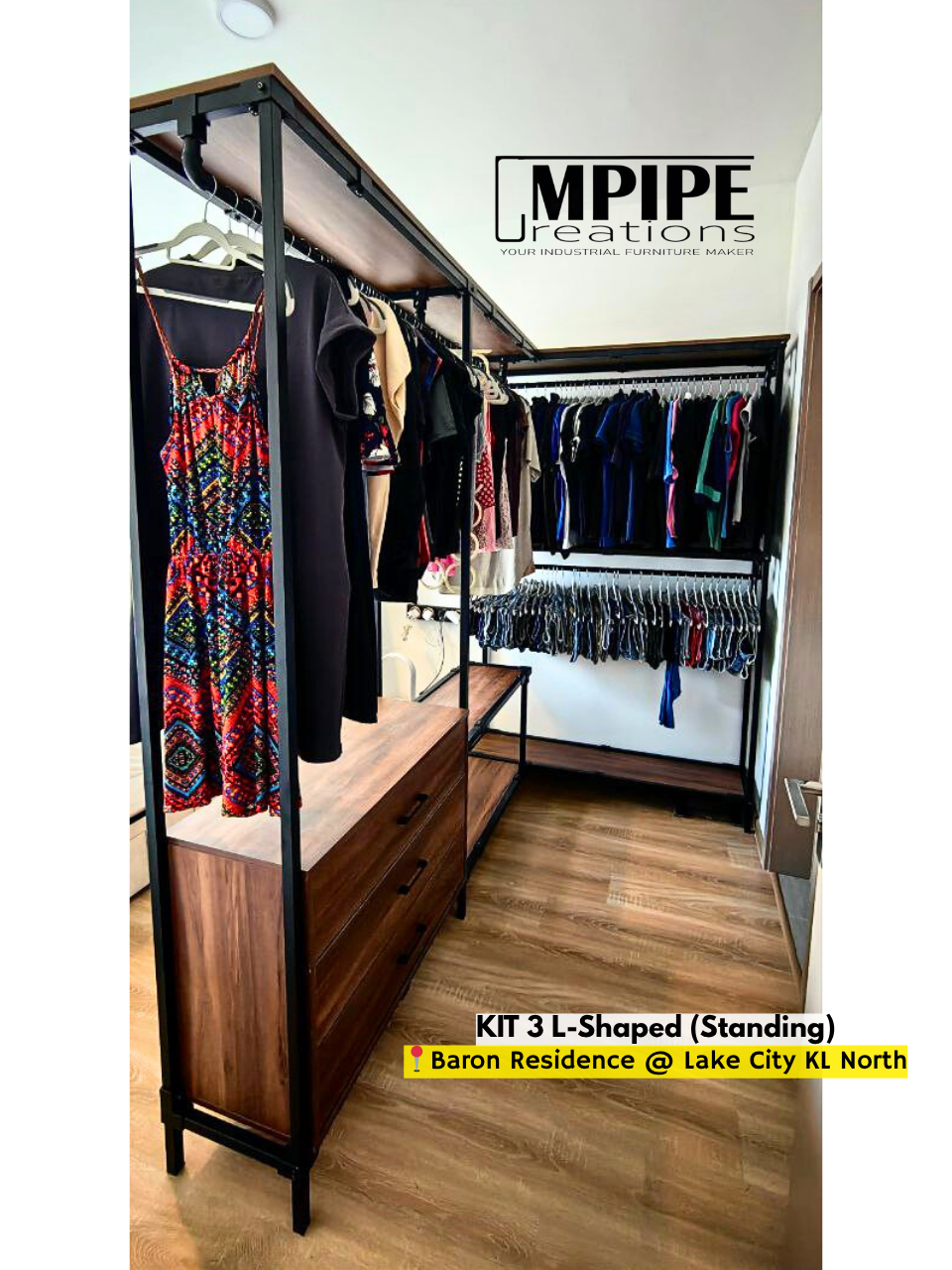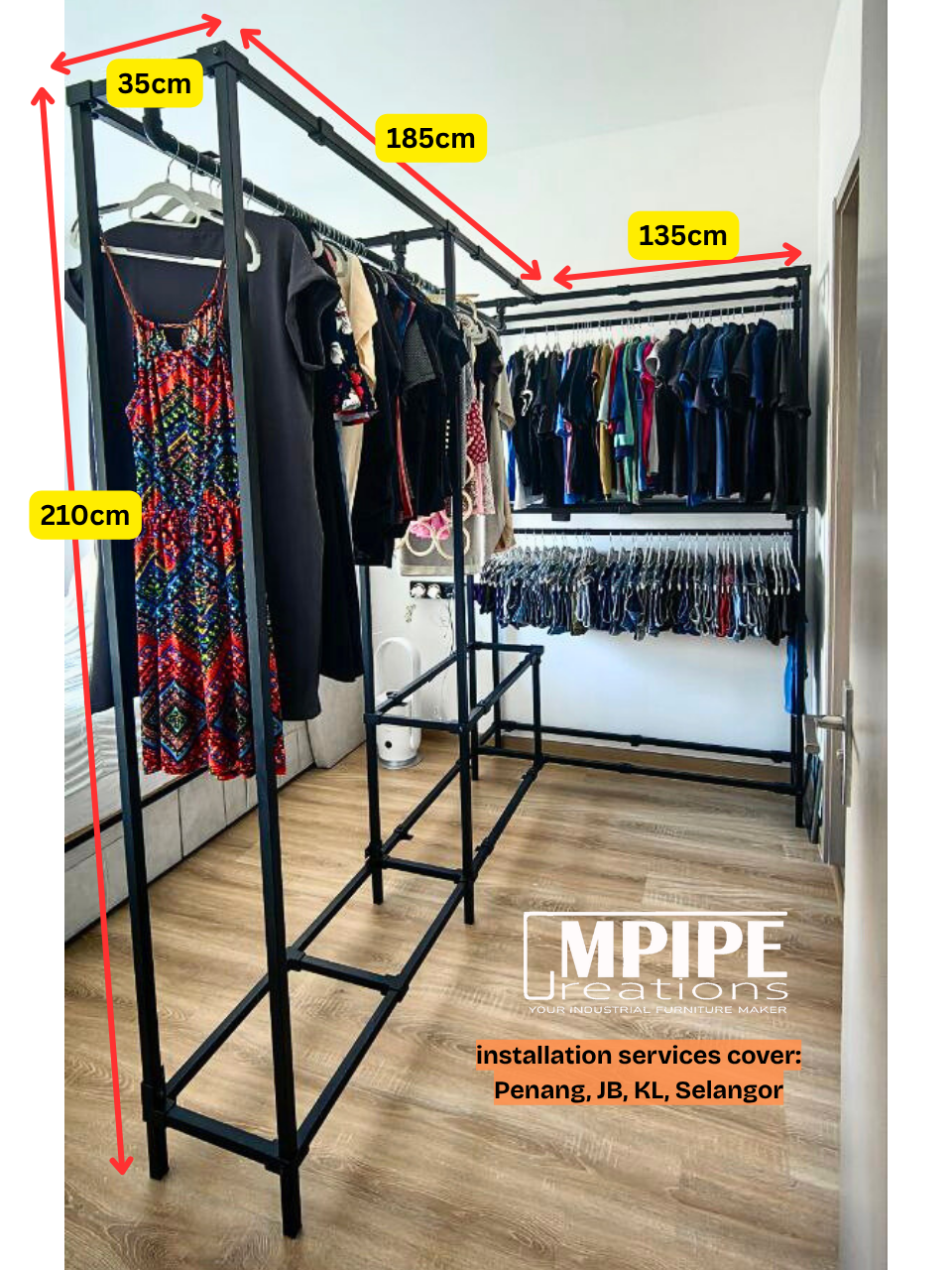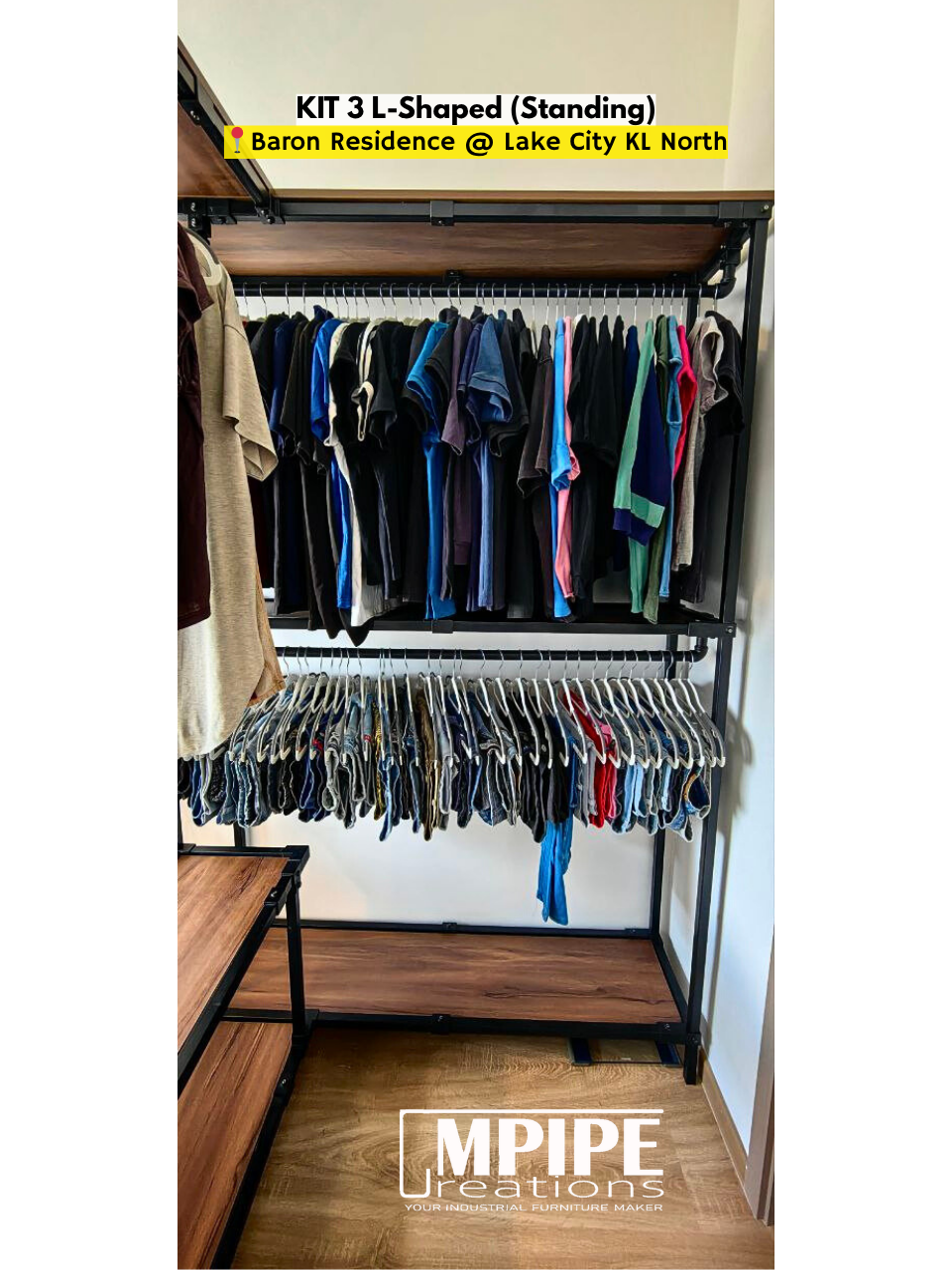 The L-Shaped Corner Clothing Rack is undeniably one of our most popular designs at M-Pipe Creations. Available in both standing and wall-mounted options, this versatile system can be paired with our premium melamine wall shelves and handcrafted drawers for a complete open wardrobe solution.