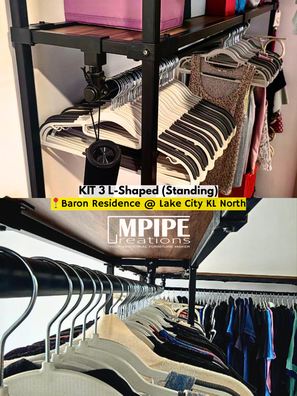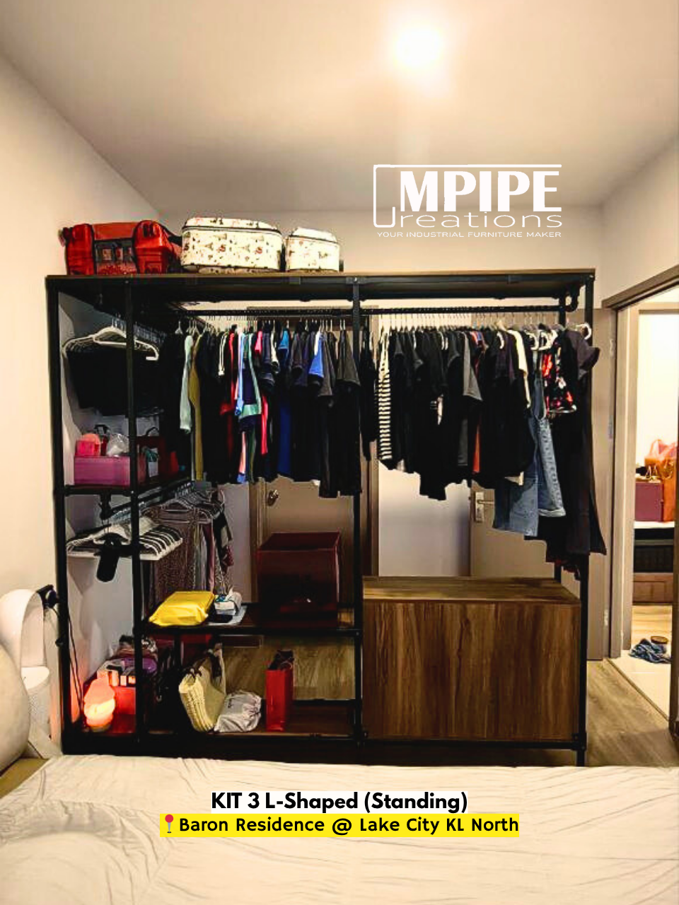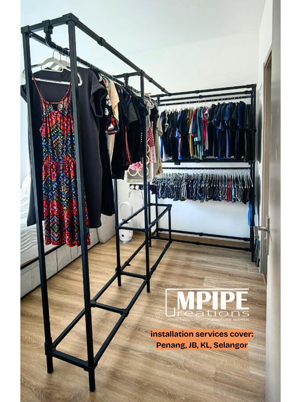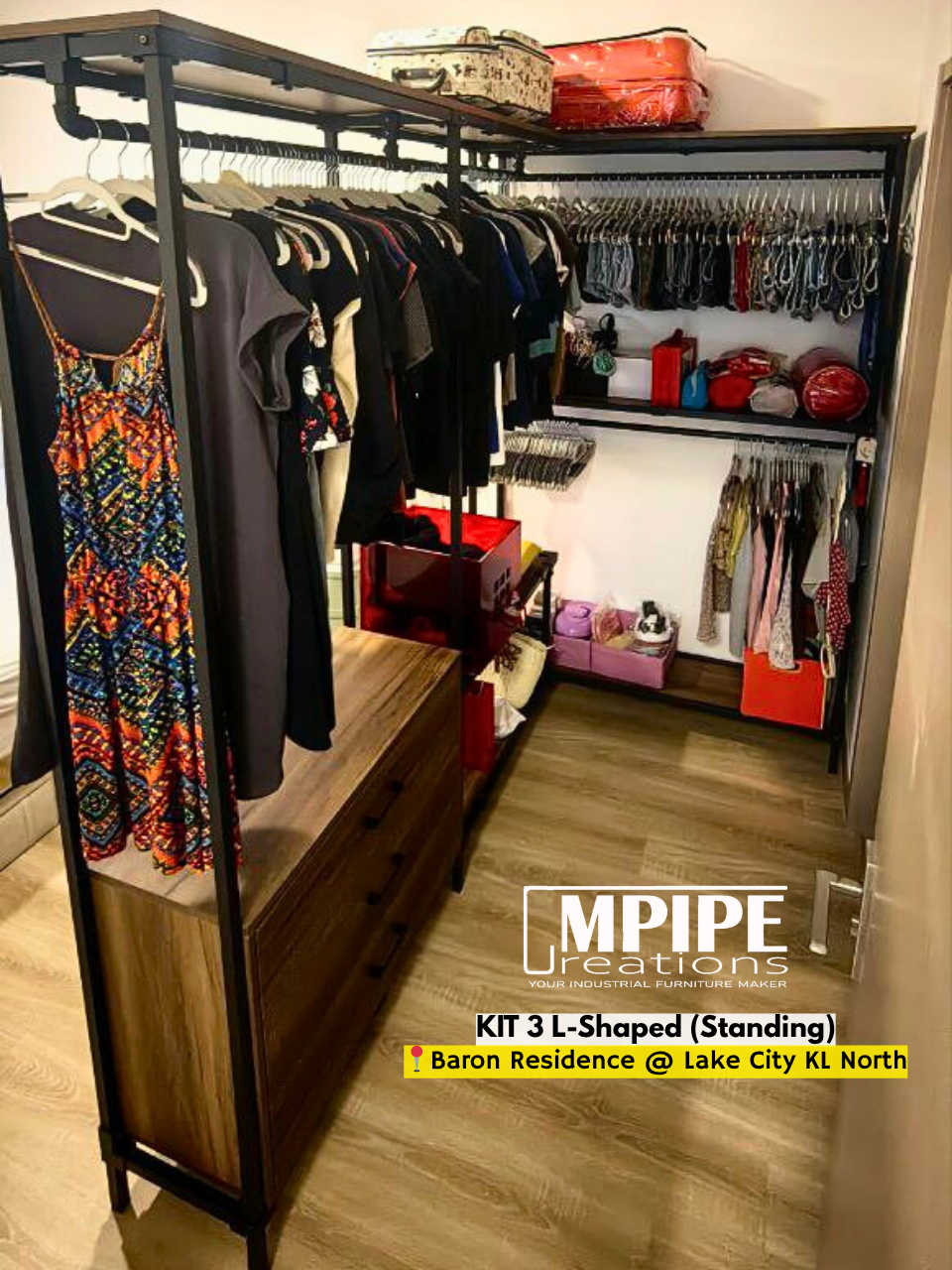 The L-Shaped Corner Clothing Rack is undeniably one of our most popular designs at M-Pipe Creations. Available in both standing and wall-mounted options, this versatile system can be paired with our premium melamine wall shelves and handcrafted drawers for a complete open wardrobe solution.