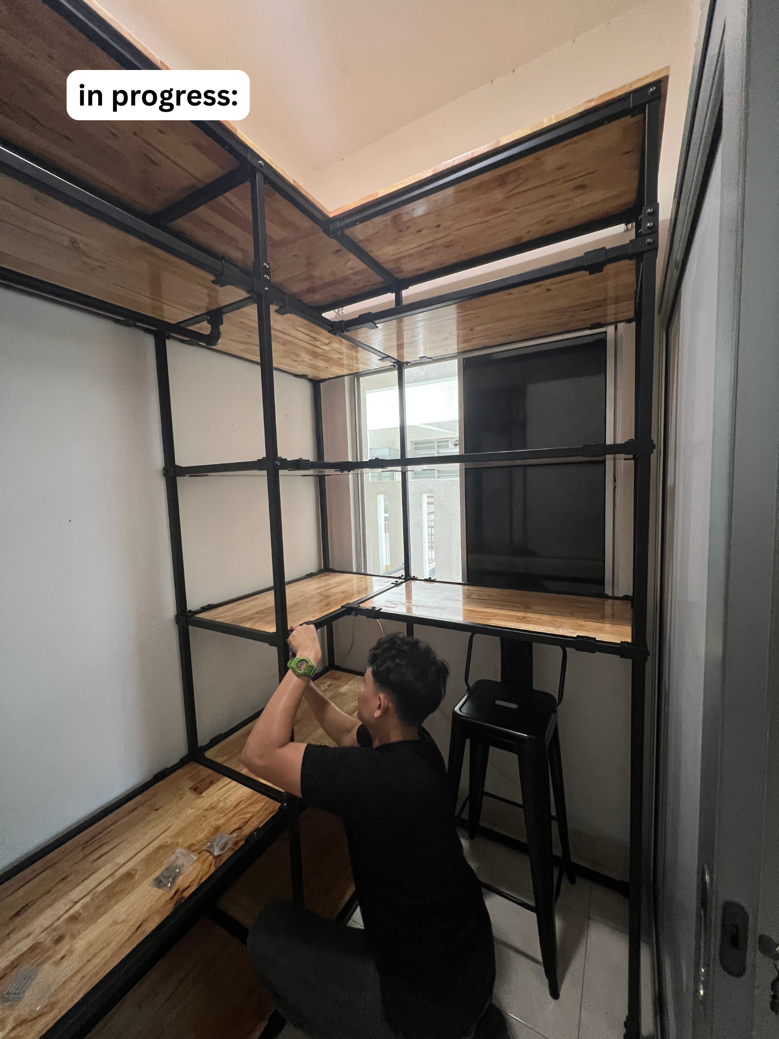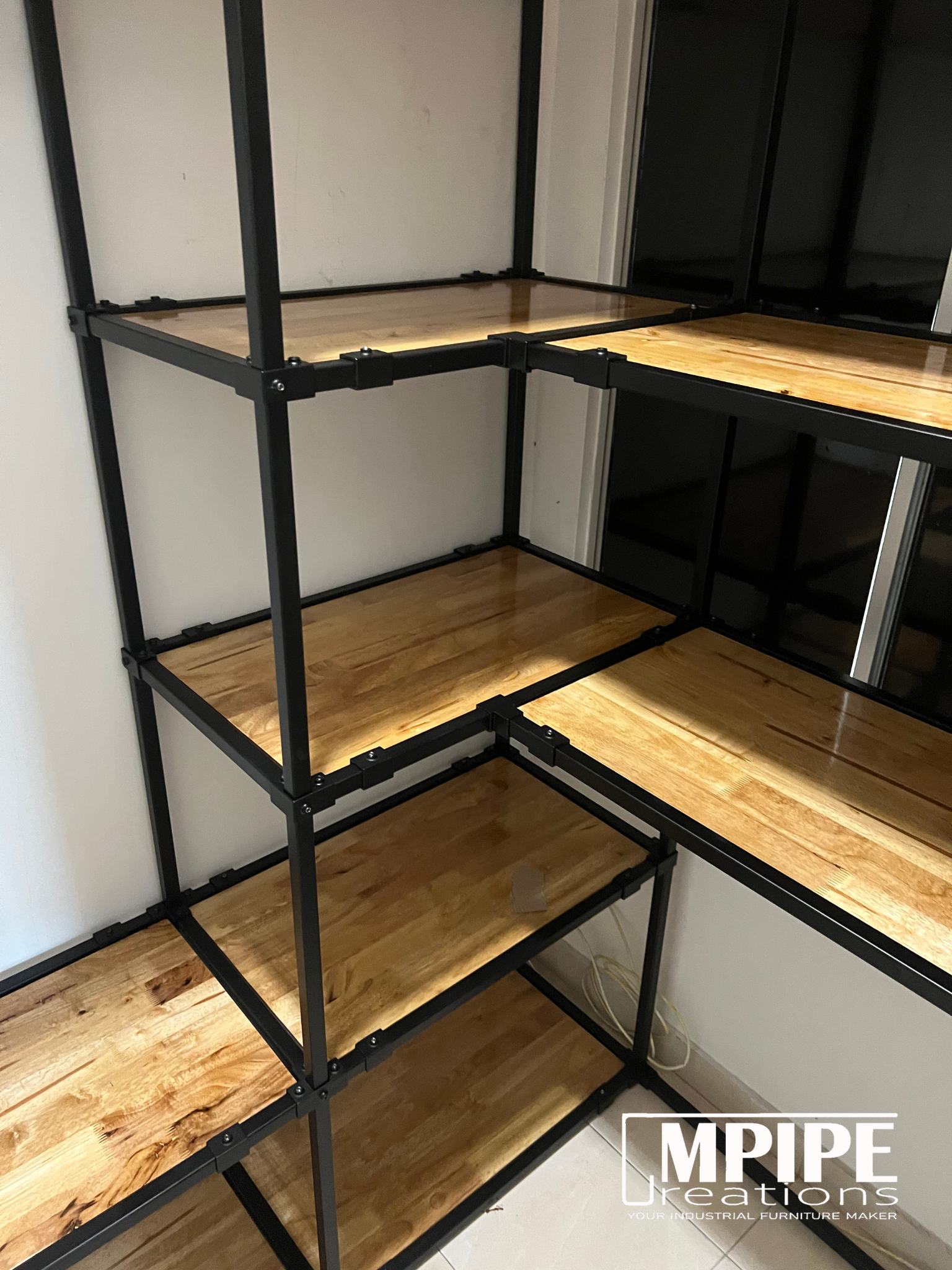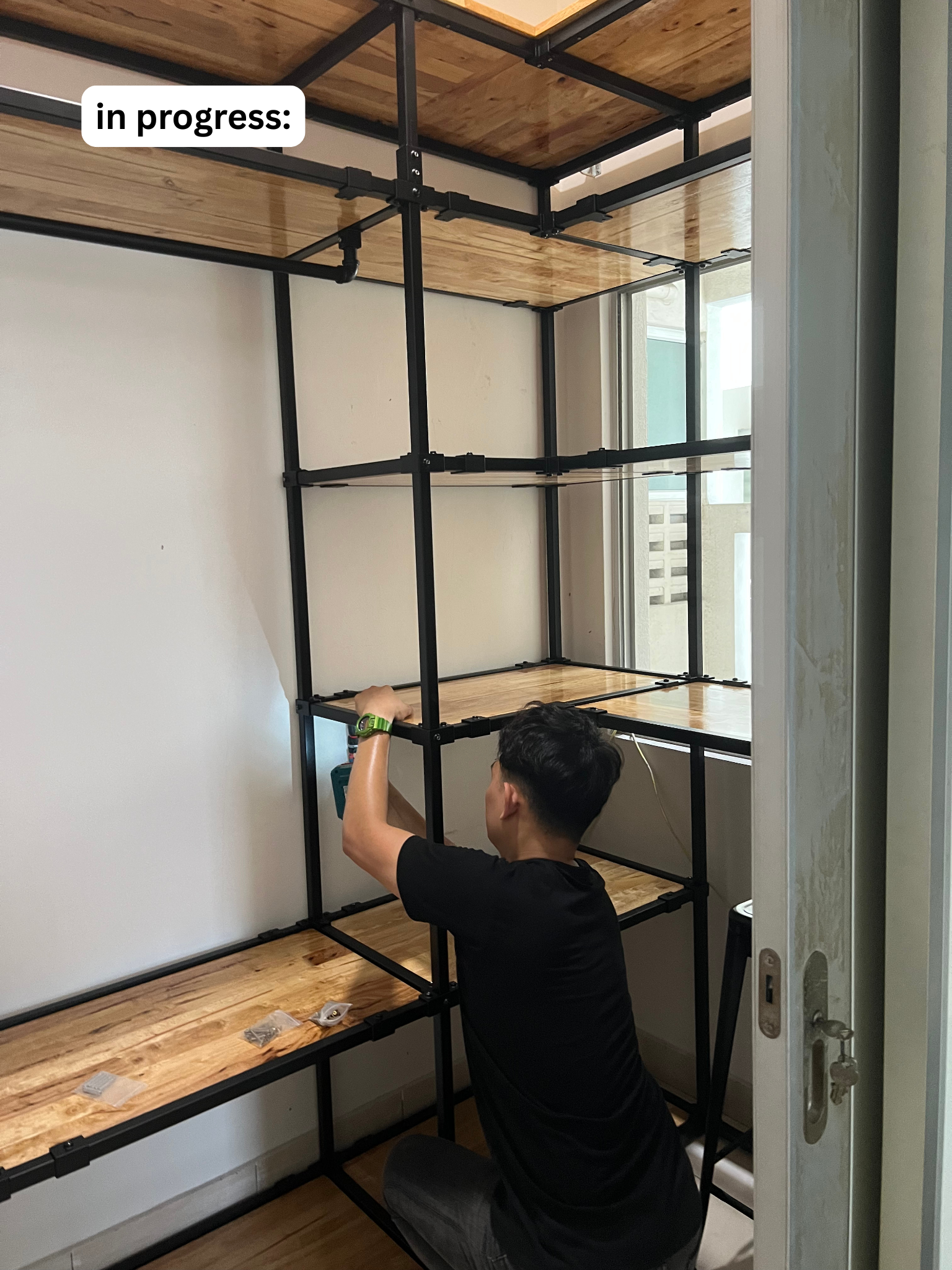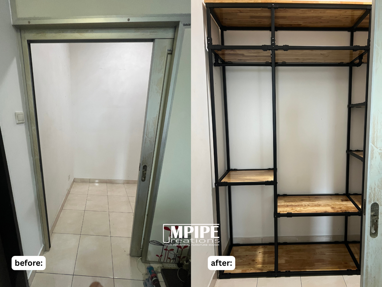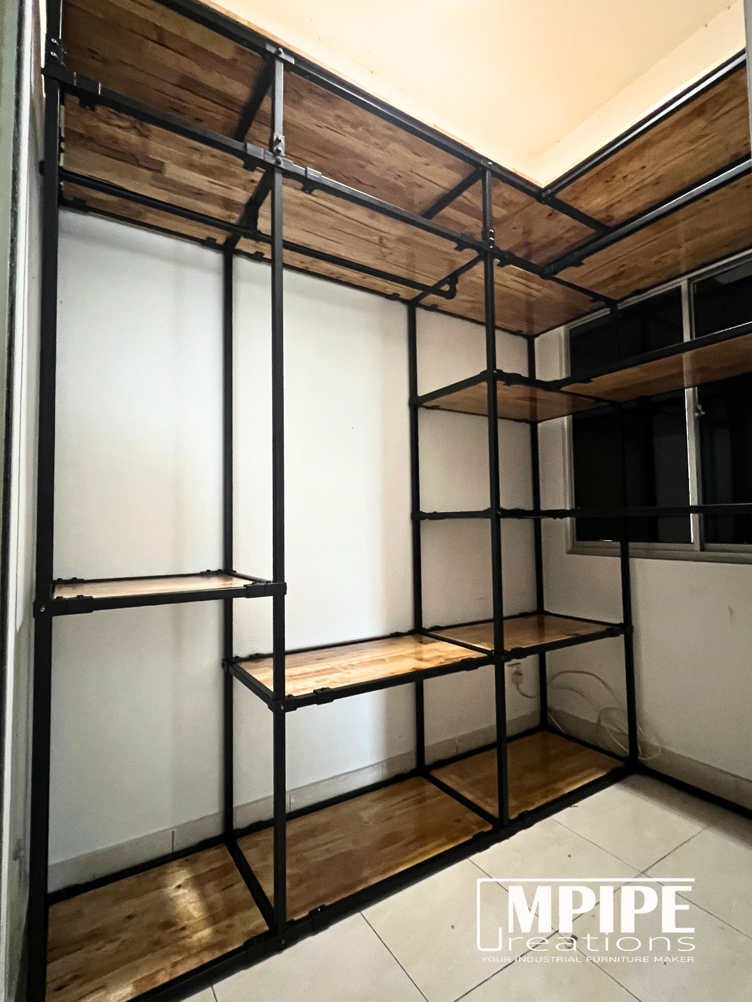 This L-shaped open wardrobe was custom-designed for a compact room measuring only 215cm x 140cm — proof that small spaces can still store big wardrobes.
