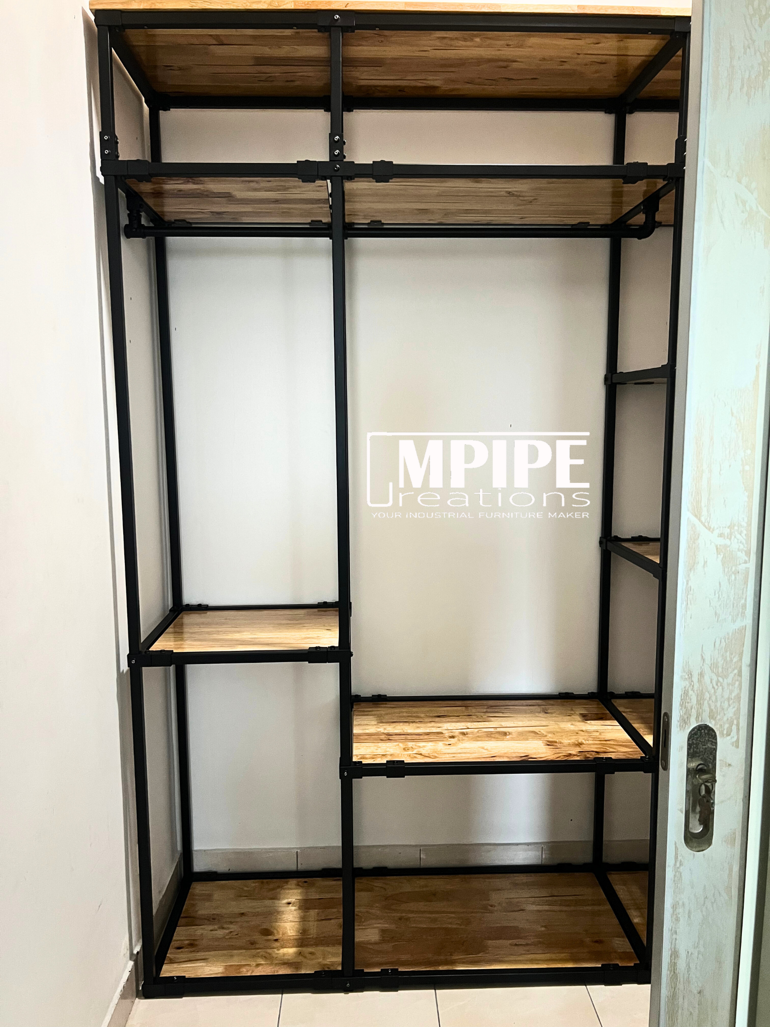 Built with a thick, sturdy hollow metal frame and multiple layers of varnished rubberwood, it transforms a narrow rectangular room into a functional wardrobe area with impressive storage capacity.