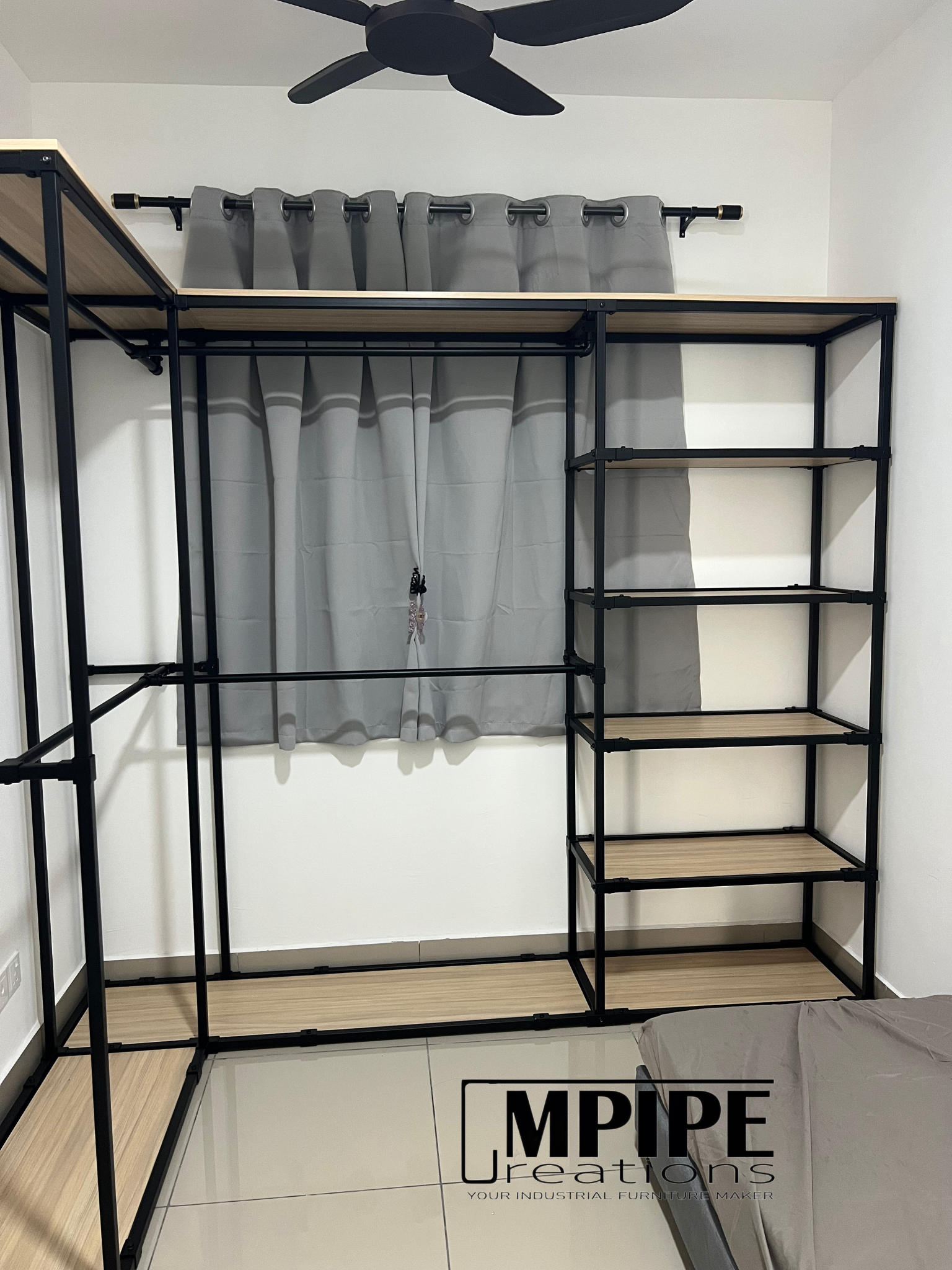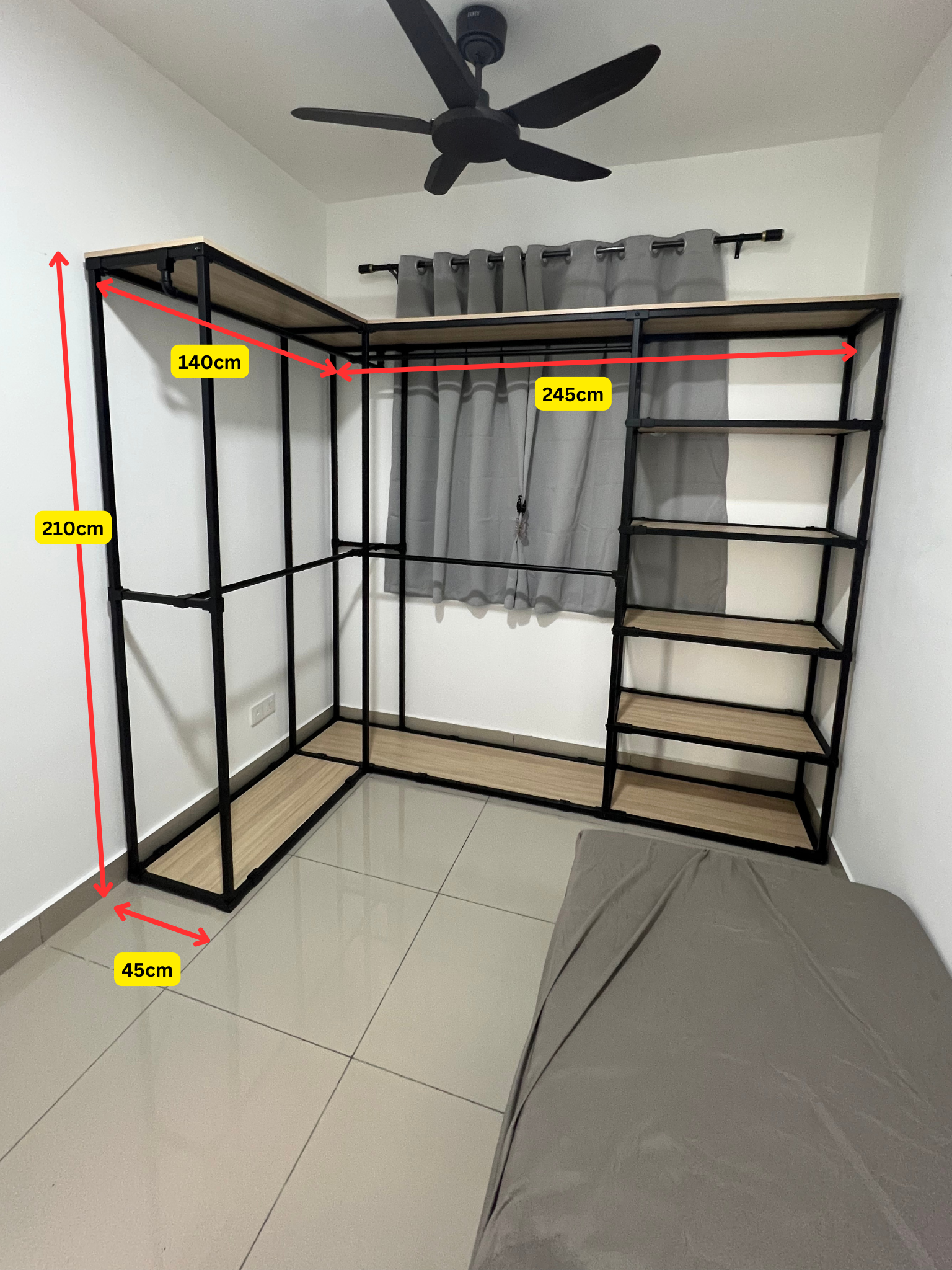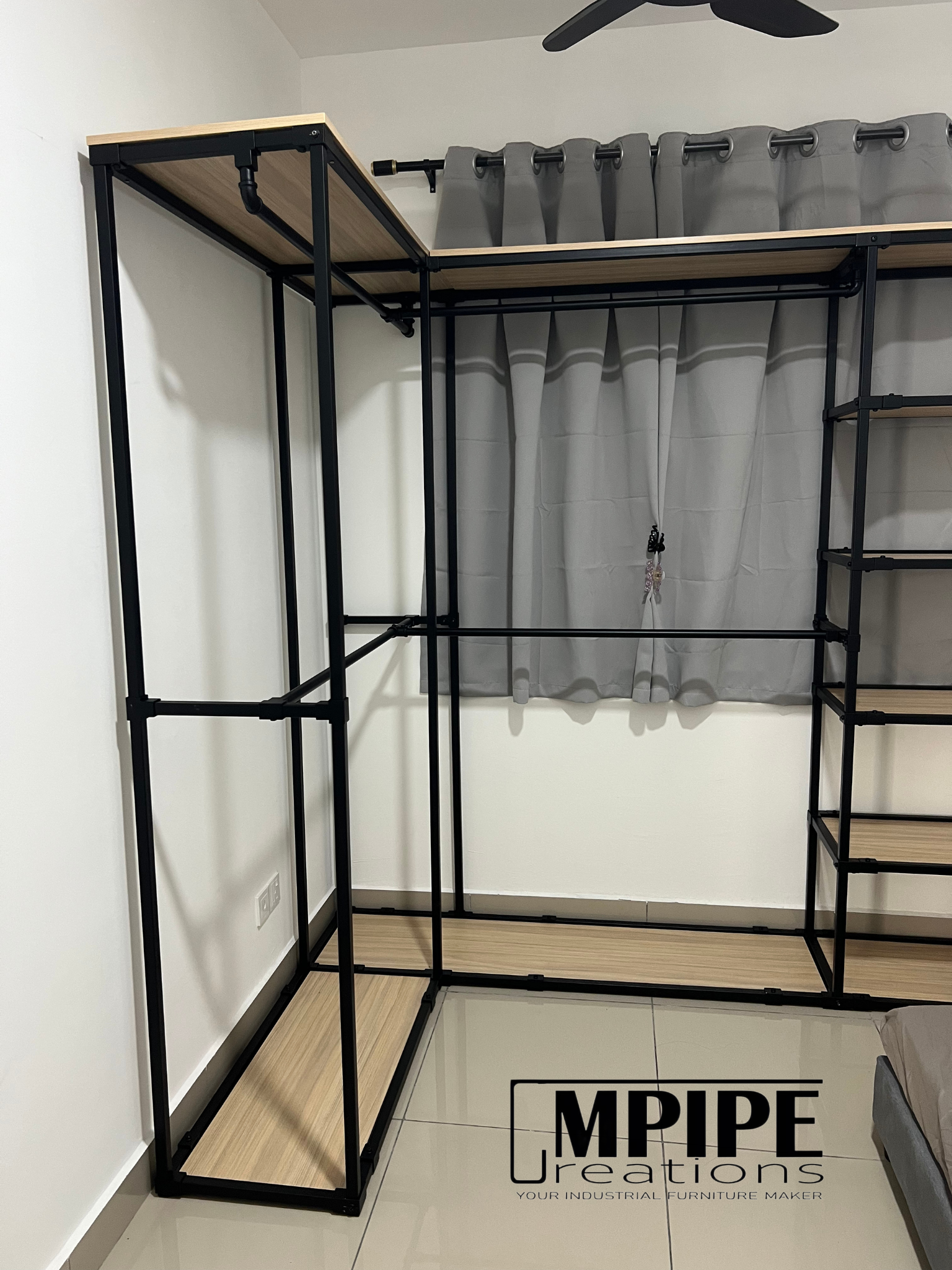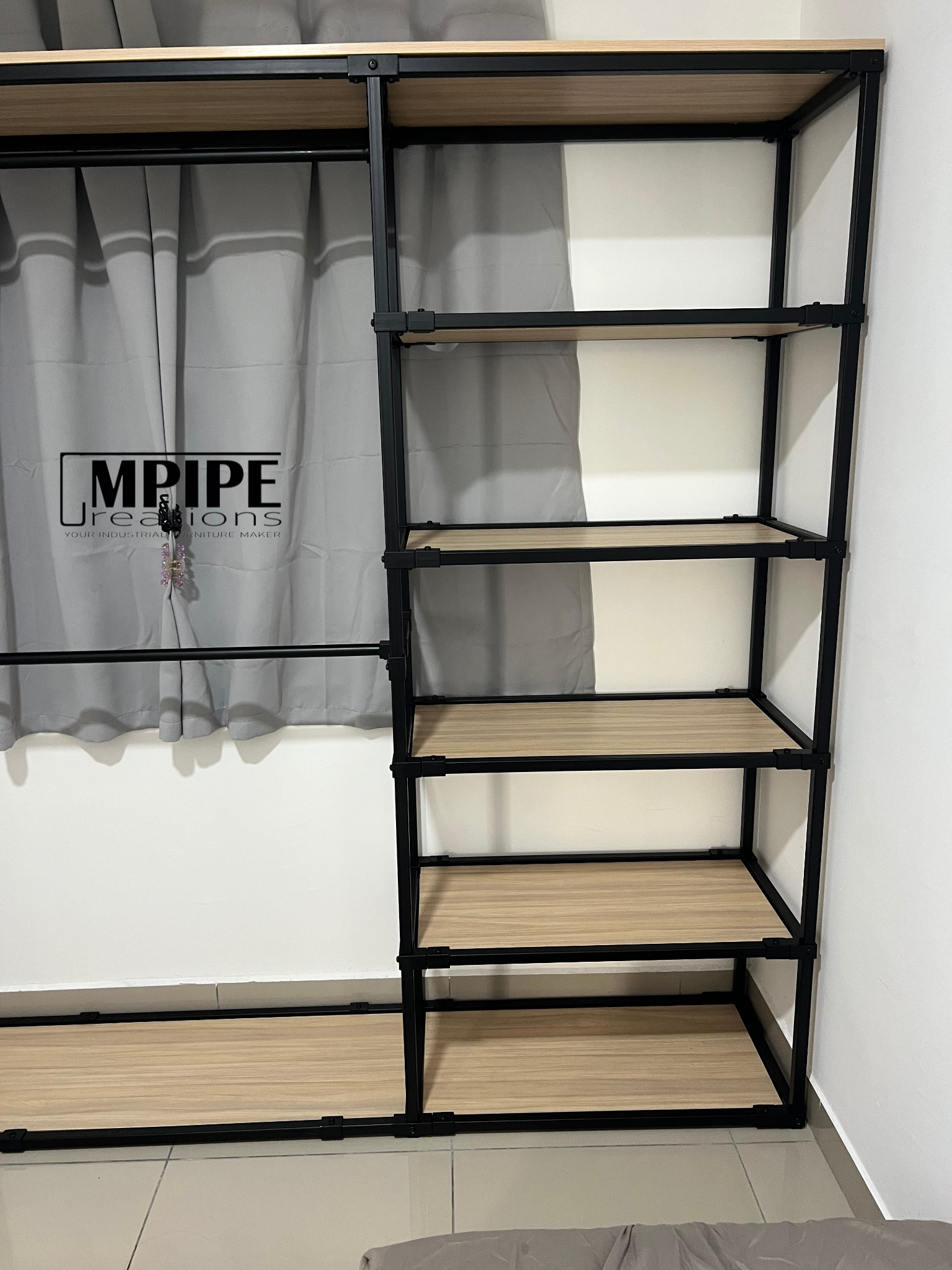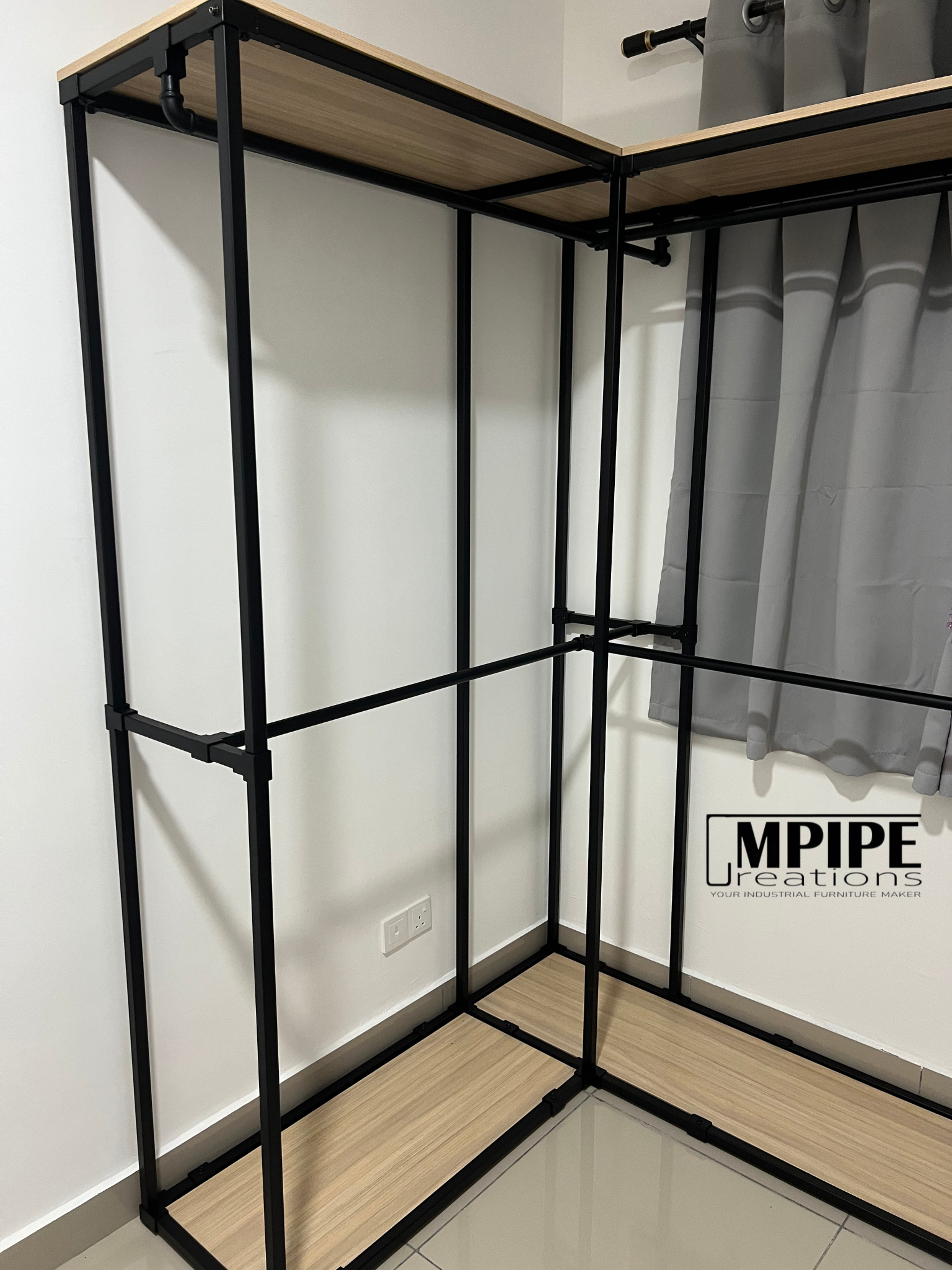 Simple, clean, and efficient — this L-shaped portable standing wardrobe is built using a durable square hollow metal frame paired with premium melamine shelving.