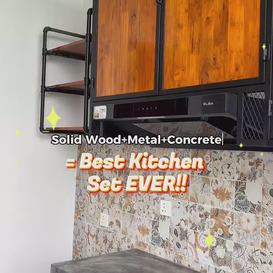 Products: Custom Metal Rubberwood Wall Shelves with Hood System + Cement Kitchen Countertop Set
