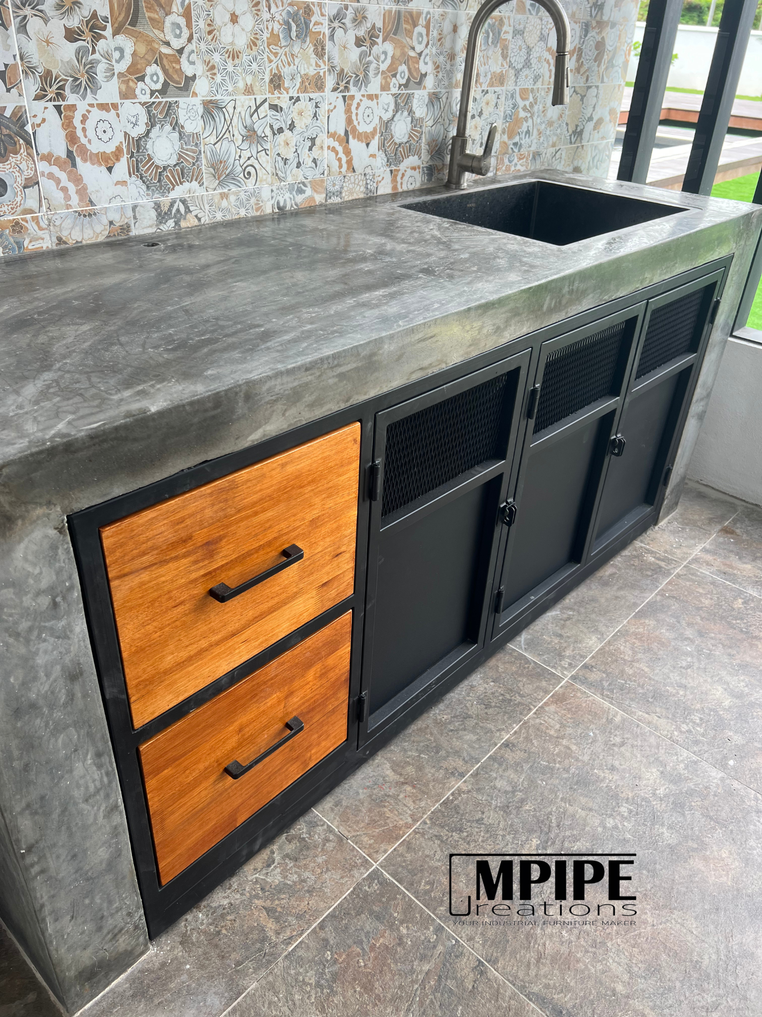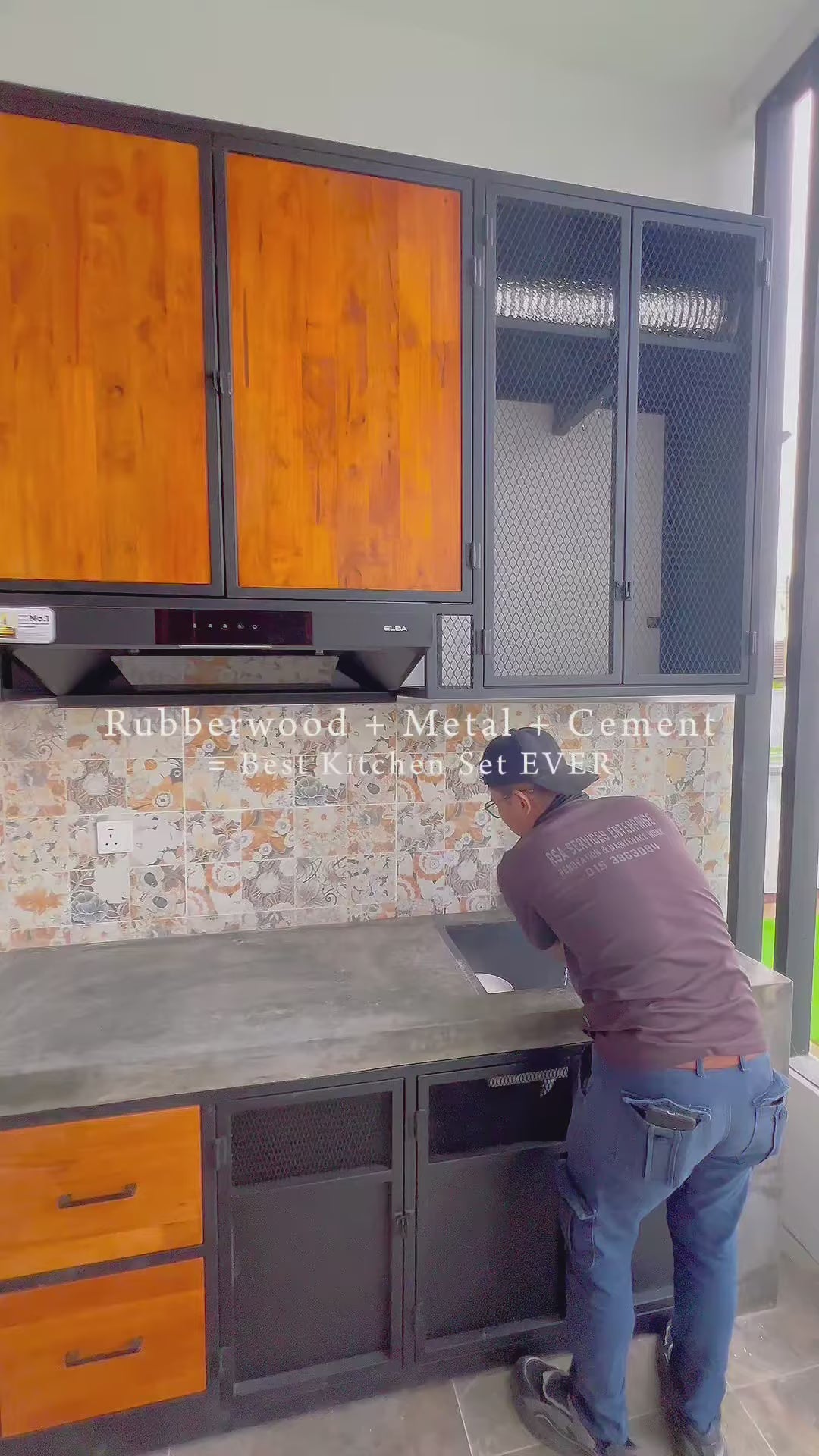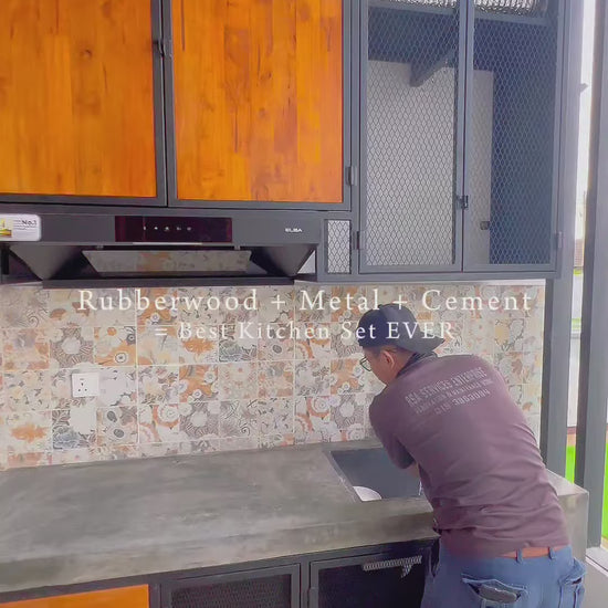 The countertop is another level of craftsmanship. Instead of a simple frame, we integrated a cement-built surface, creating a solid foundation before fitting our metal cabinet seamlessly into the cement frame. The result? A tight, clean finish and a durable combination of cement, metal, and rubberwood — built to last and built to impress.