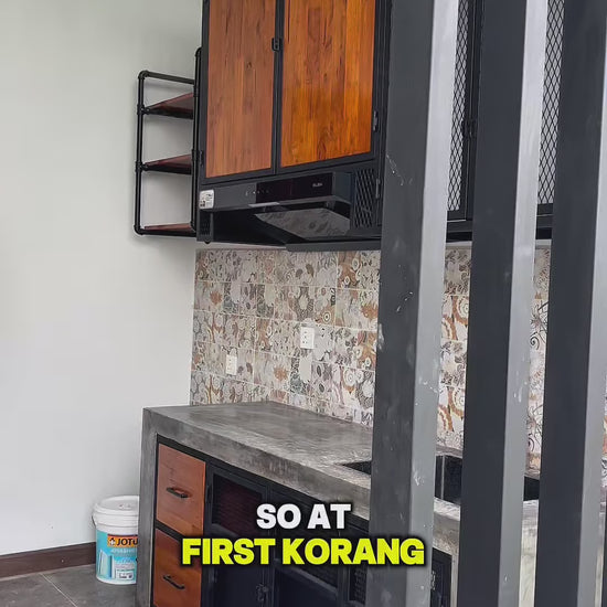 The wall shelves are constructed with a strong metal frame and varnished rubberwood, offering both style and serious storage. And this isn’t your typical shelving — we drilled and installed the hood system directly into the structure, making it efficient and ready for real kitchen use. Perfect for displaying cookware, plates, and all your essentials.