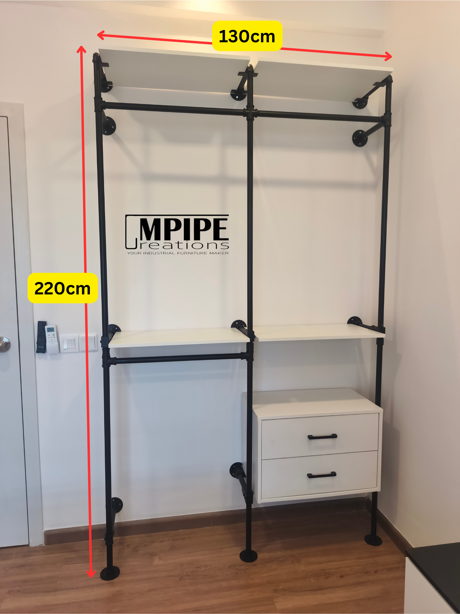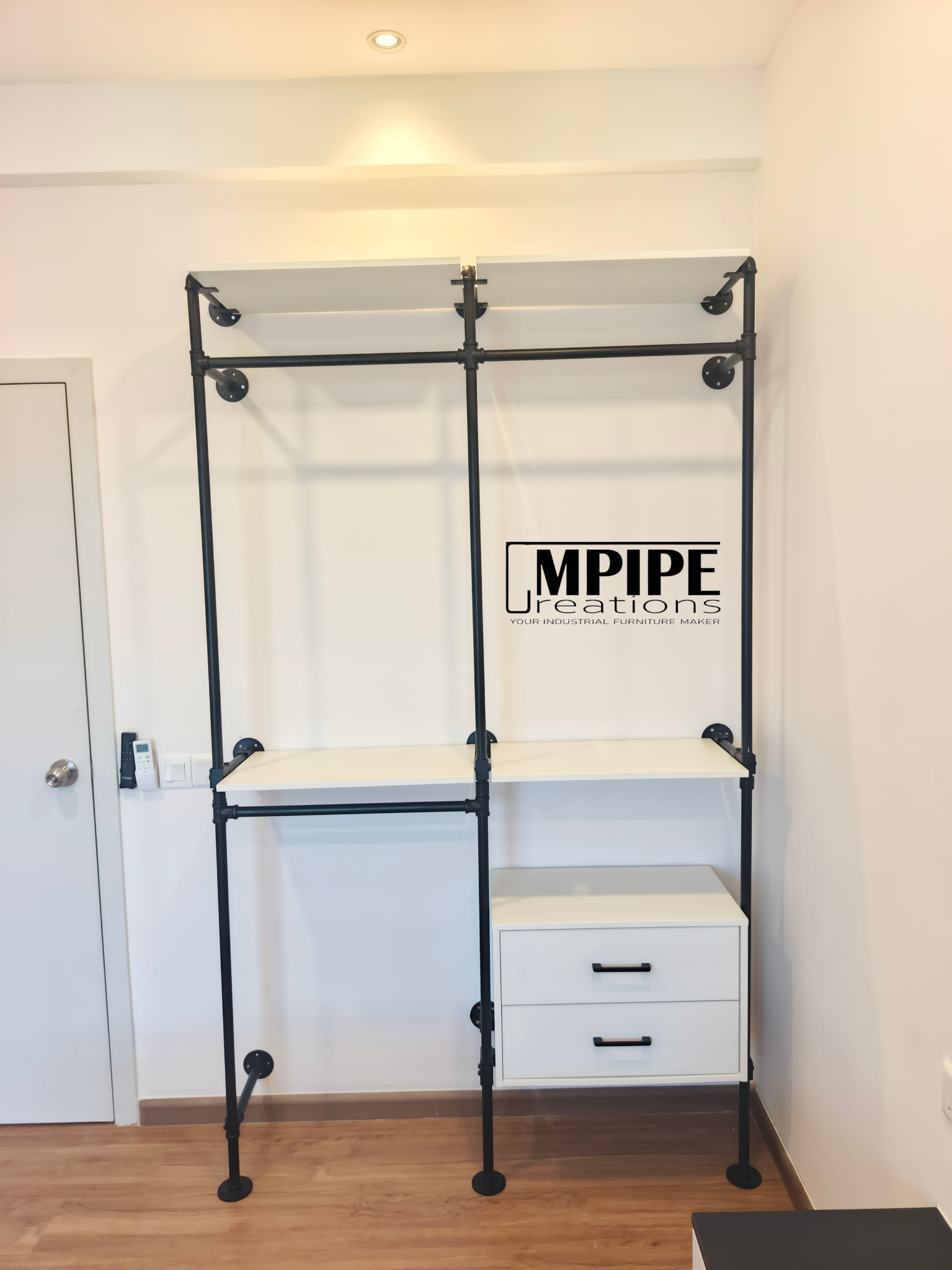A Striking Visual Punch: Imagine the deep, matte strength of black powder-coated GI pipes framing the crisp, clean surfaces of pure white premium melamine. This high-contrast combo isn't just a wardrobe; it's a piece of industrial art for your wall!