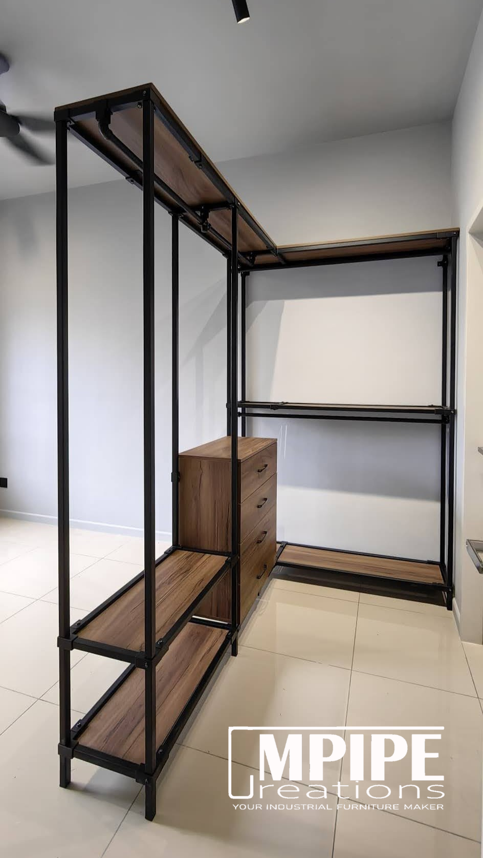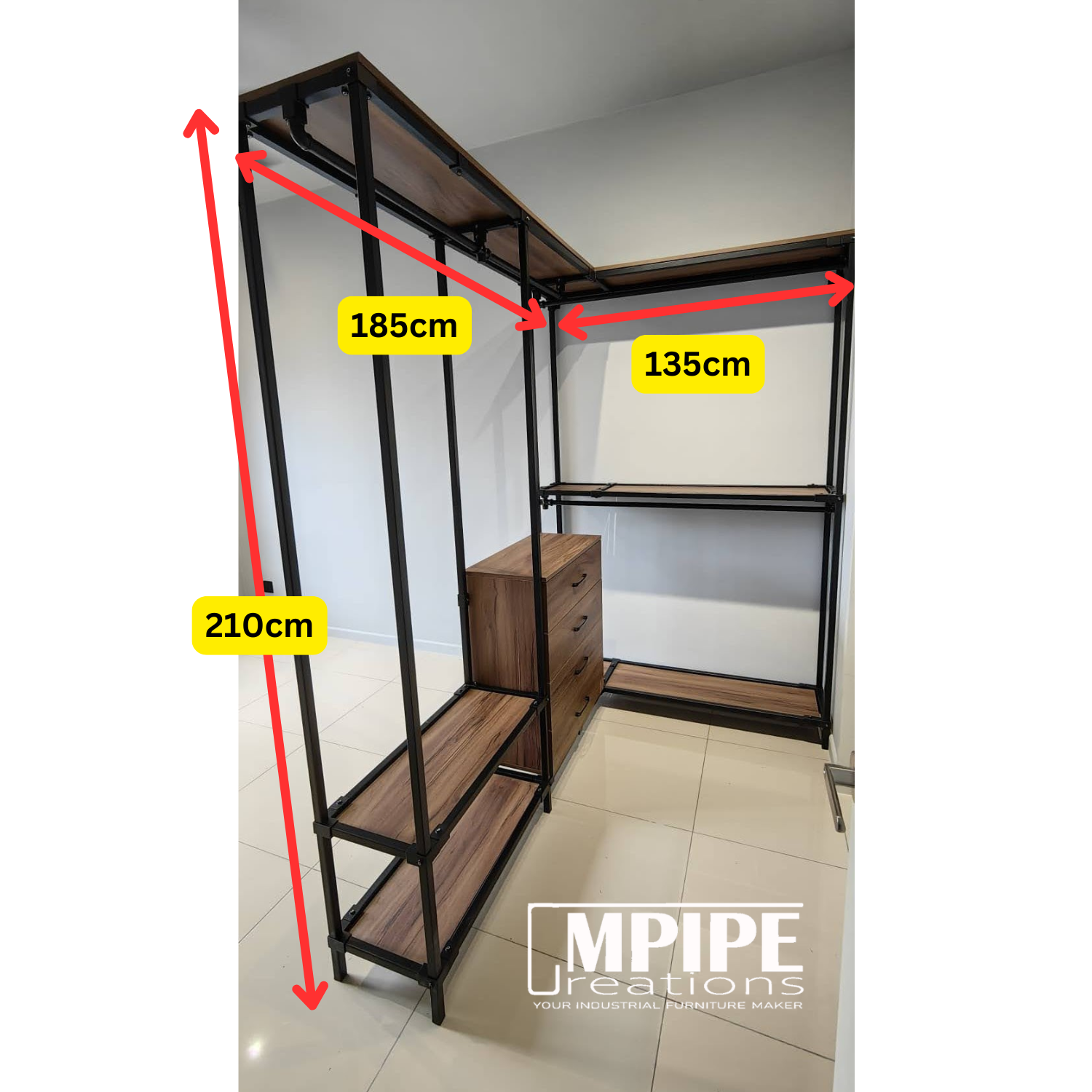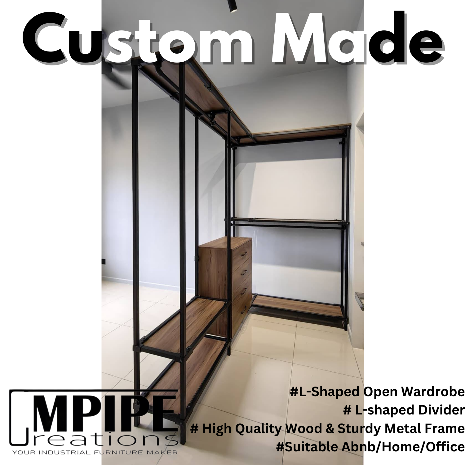 Designed for both practicality and aesthetics, our custom L-Shape Clothing Rack with Drawer Cabinet is a space-saving solution that seamlessly integrates storage and room separation. Unlike traditional clothing racks placed against a wall, this unique design stands independently, functioning as both a wardrobe and a room divider.