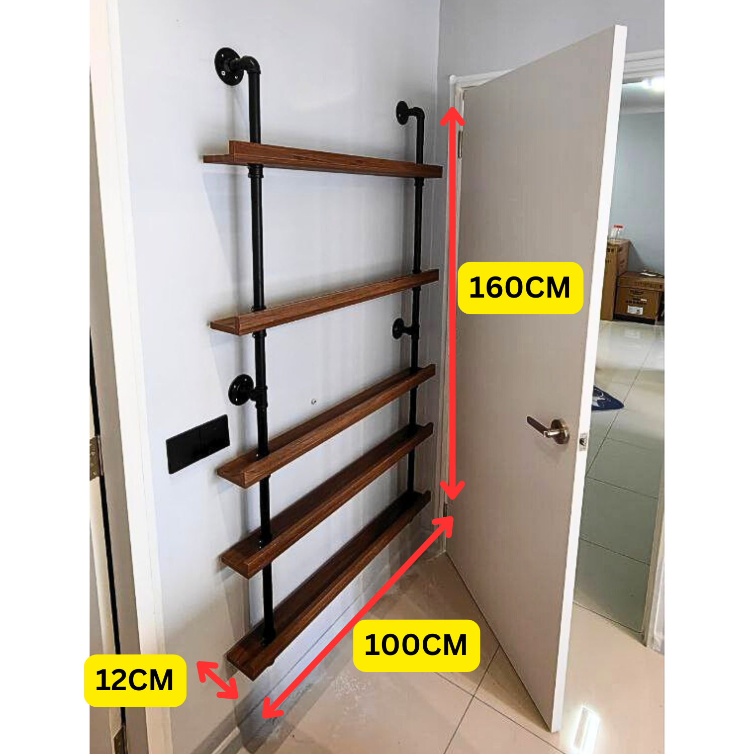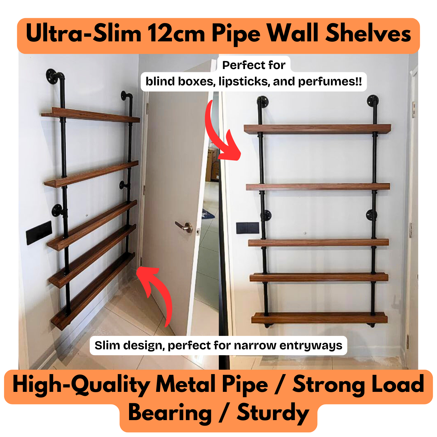 Designed to maximize space, the slim wall shelf fits perfectly in a narrow entryway—ideal for displaying a blind box collection now and perfumes in the future. Made from durable metal pipes and premium laminate, this shelf is both sturdy and stylish, adding a sleek touch to any space.