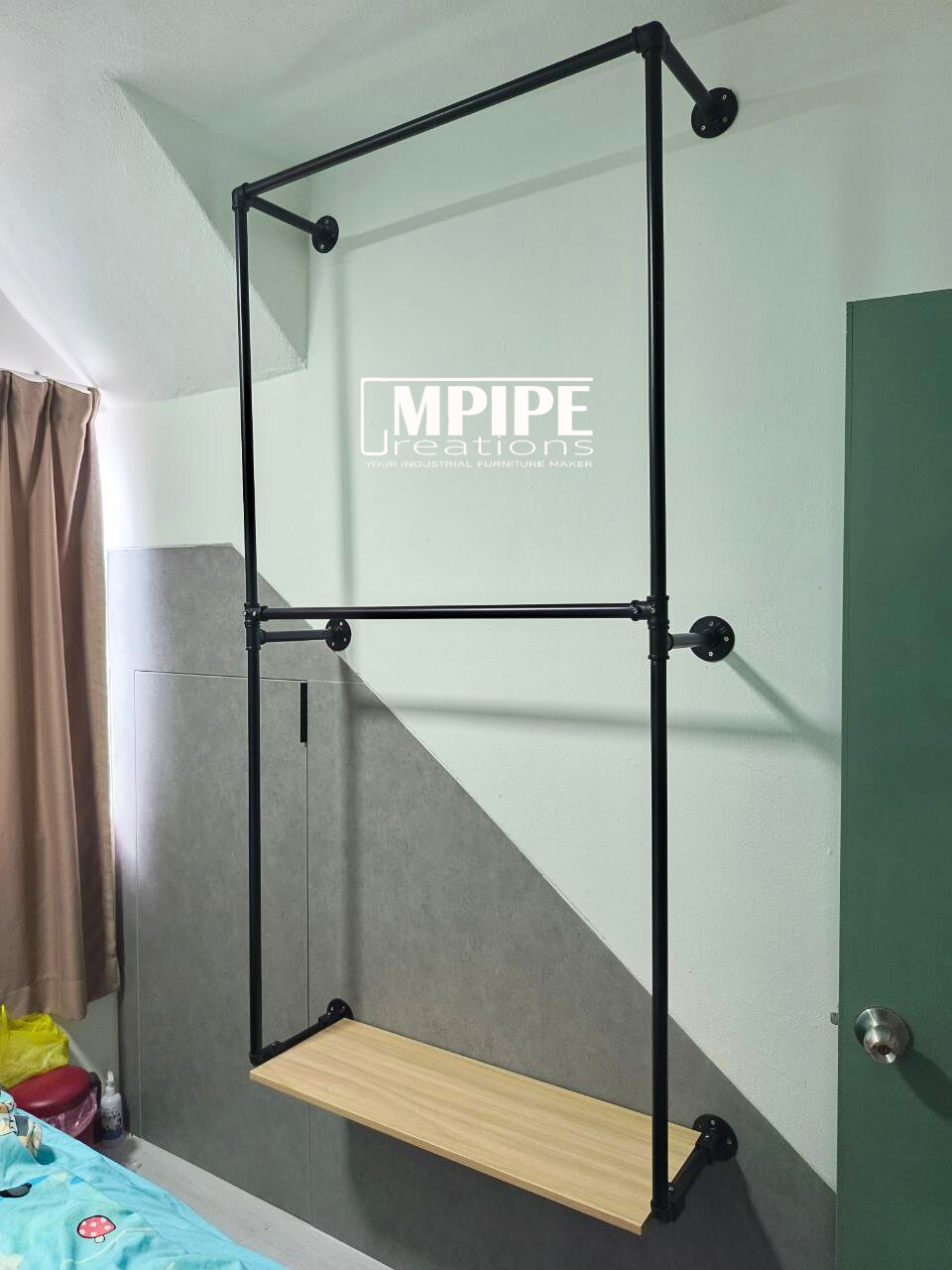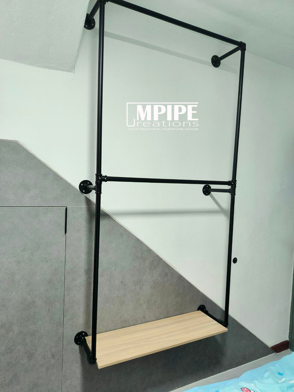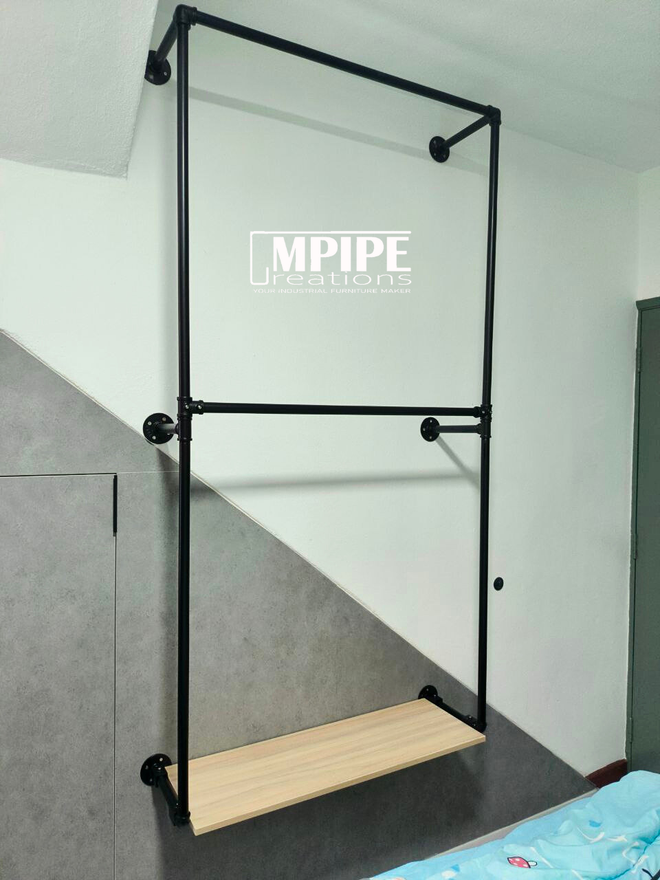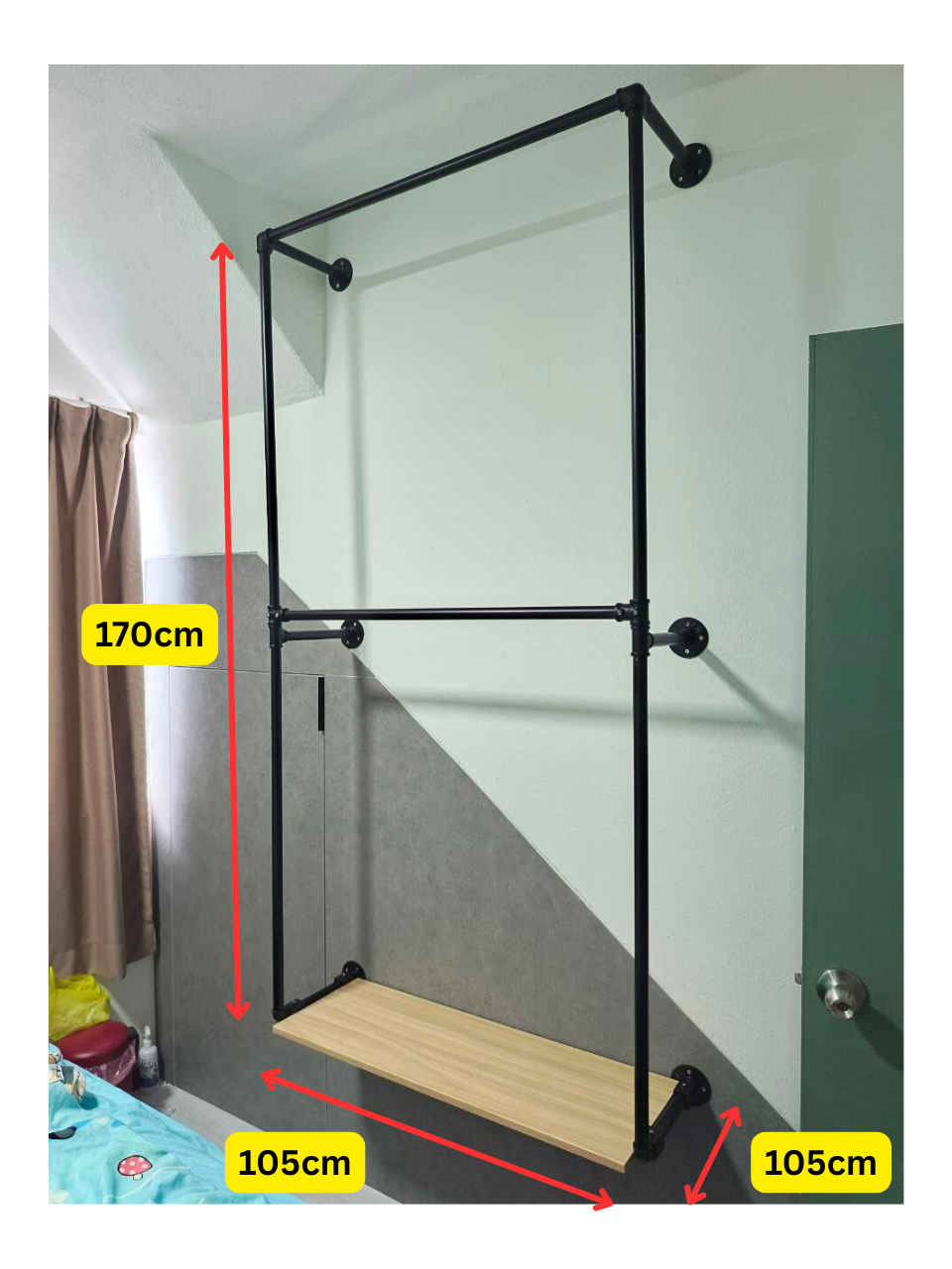 We built a rack 105cm long and 170cm high, with a bottom gap of 30cm, plus a solid rubberwood shelf for folded clothes.