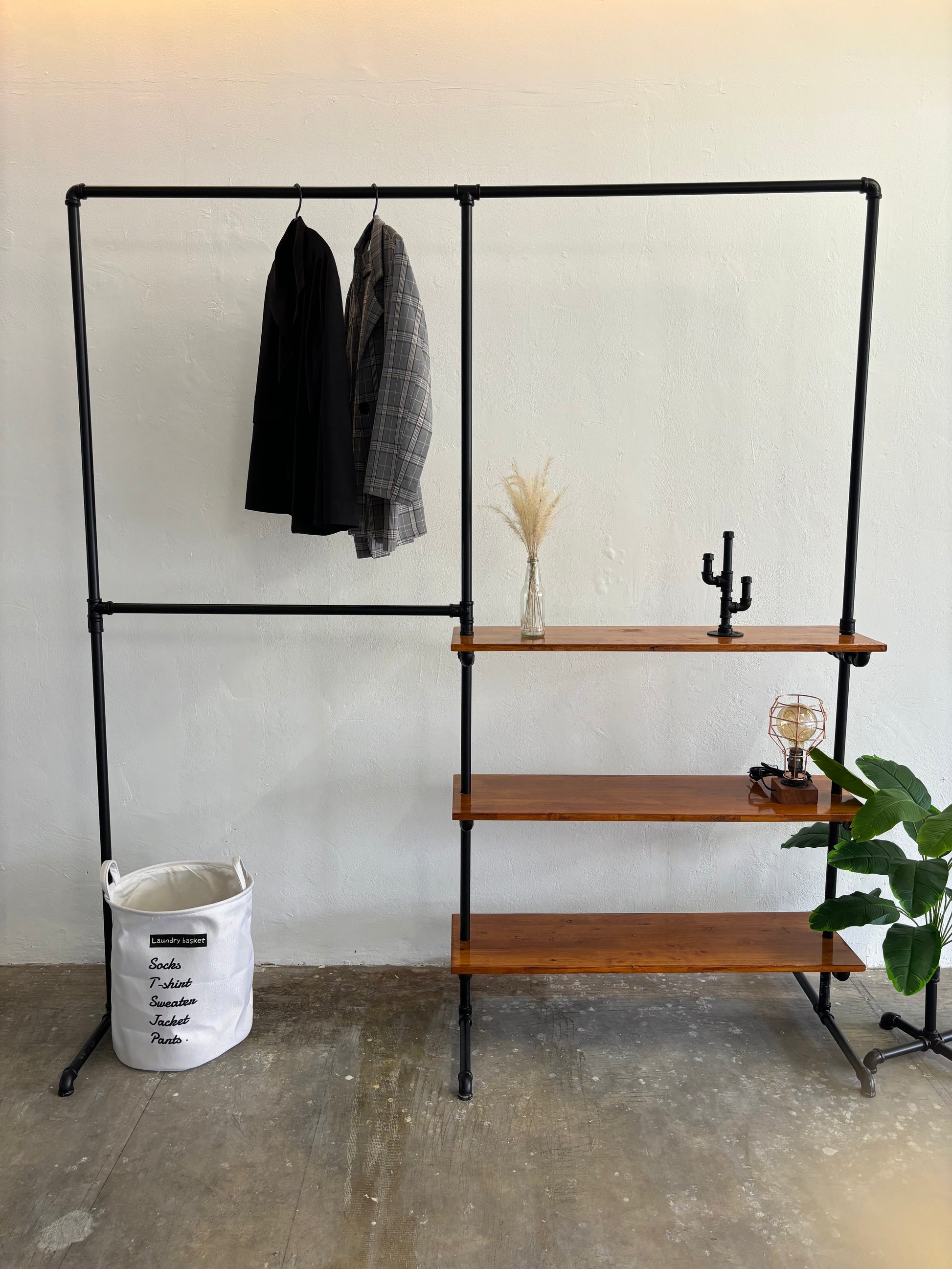 - Made from solid steel pipes and rubberwood shelves in a rustic industrial style.