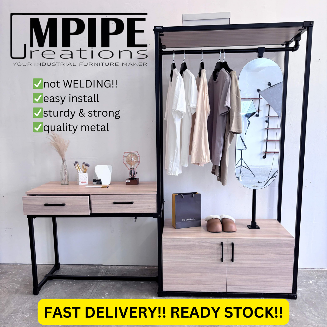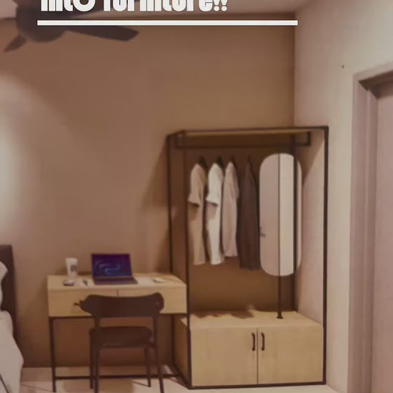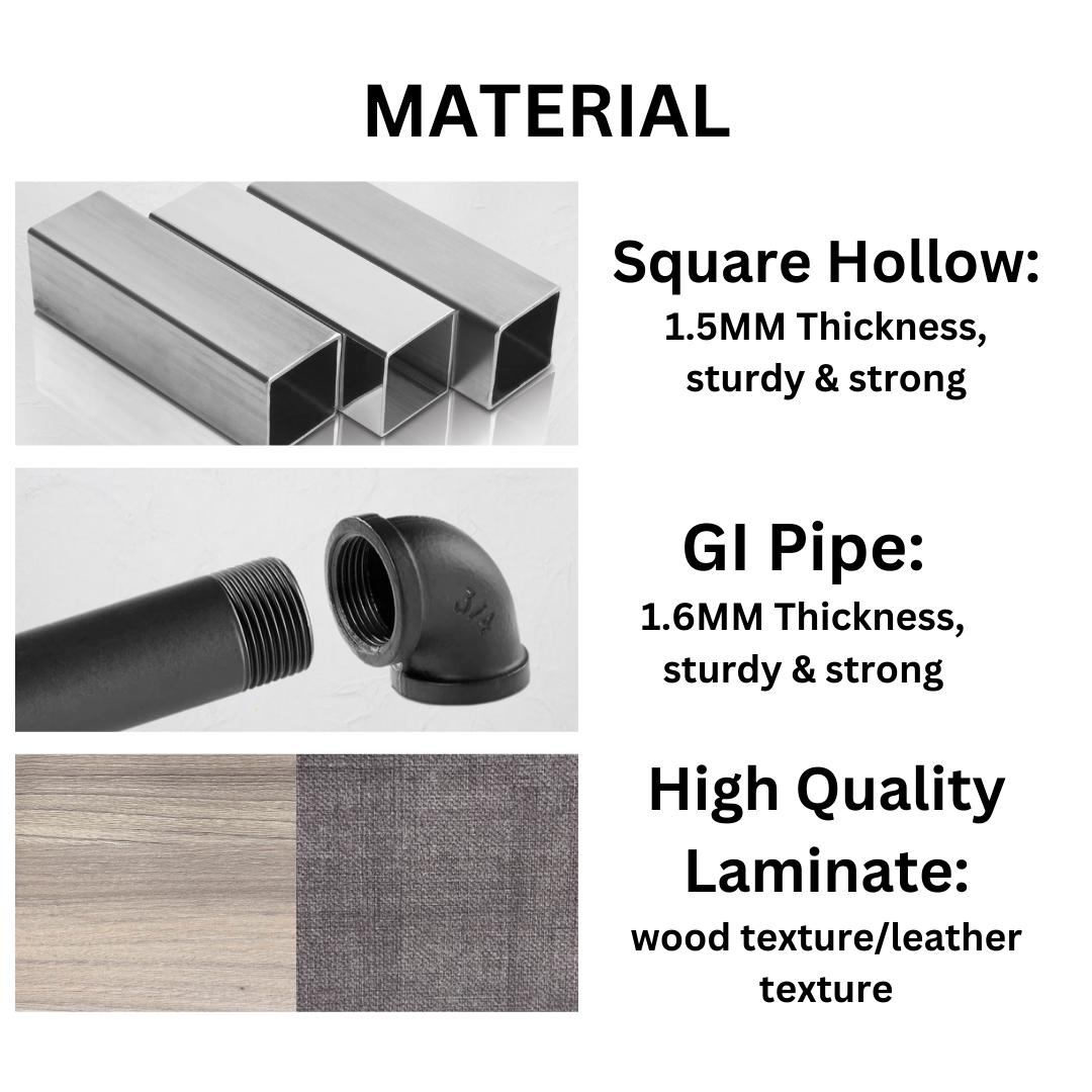 Crafted from durable square hollow pipes (1.5mm thick) and GI pipes (1.6mm thick with deep threading), this piece combines strength and elegance. Coated in powder black, it’s paired with waterproof laminated drawers, cabinets, and boards for added practicality and style. The rotating mirror adds functionality while enhancing its aesthetic appeal.