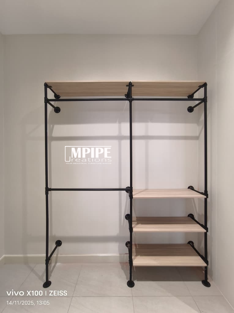 - Made from solid matte black steel pipes and rubberwood in a rustic industrial style.