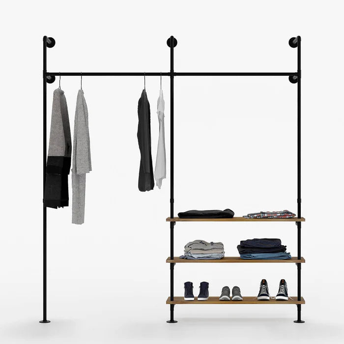 - Made from solid matte black steel pipes and rubberwood in a rustic industrial style.